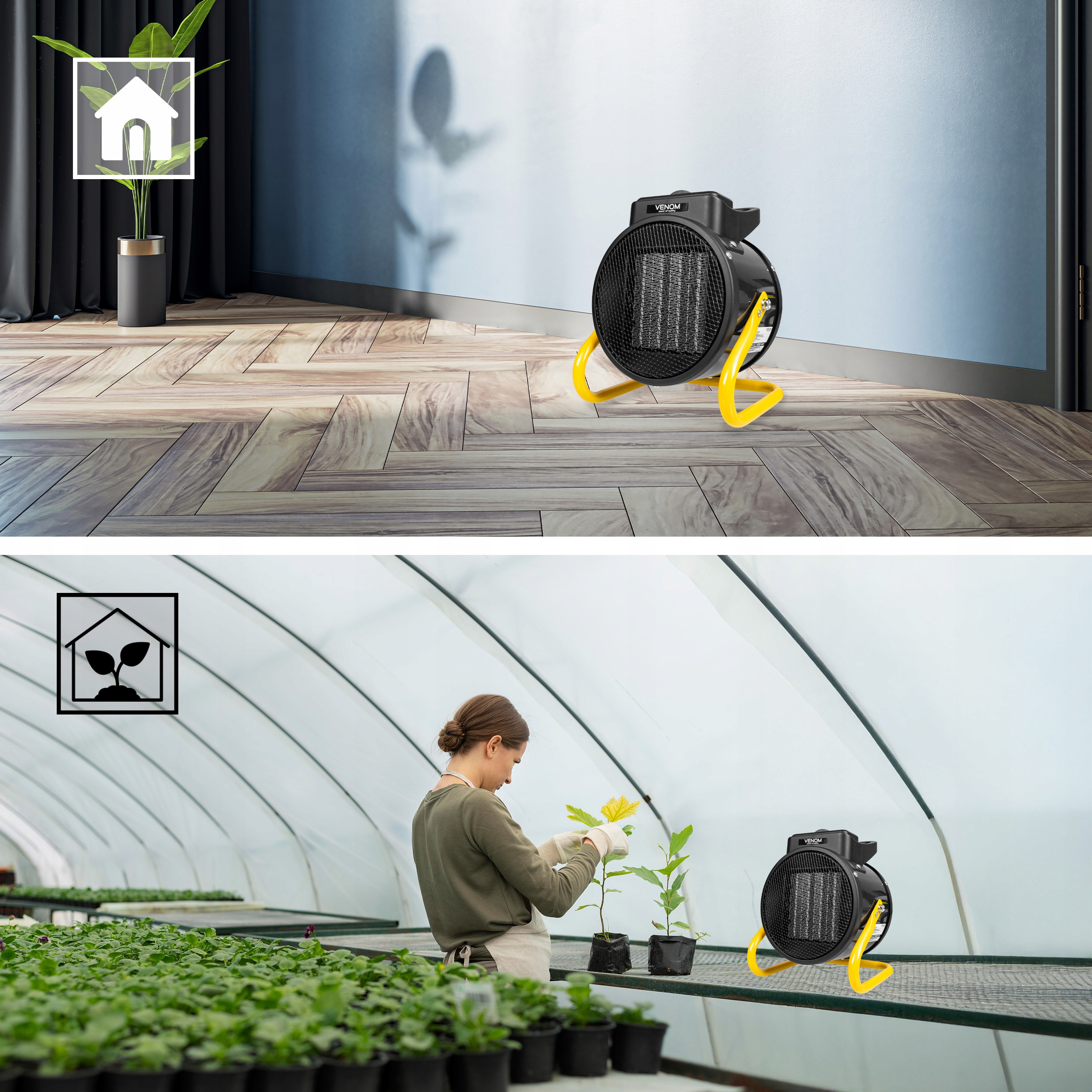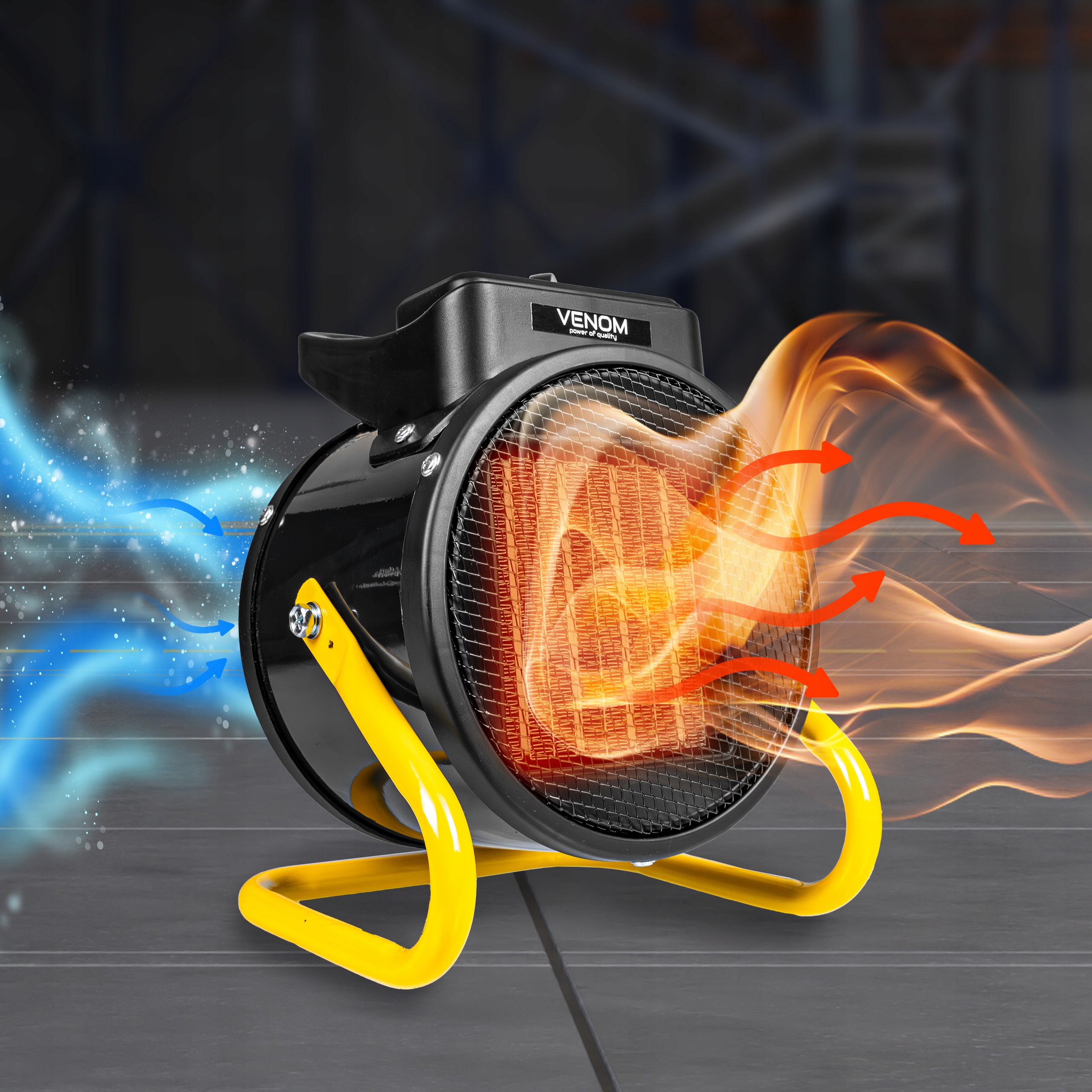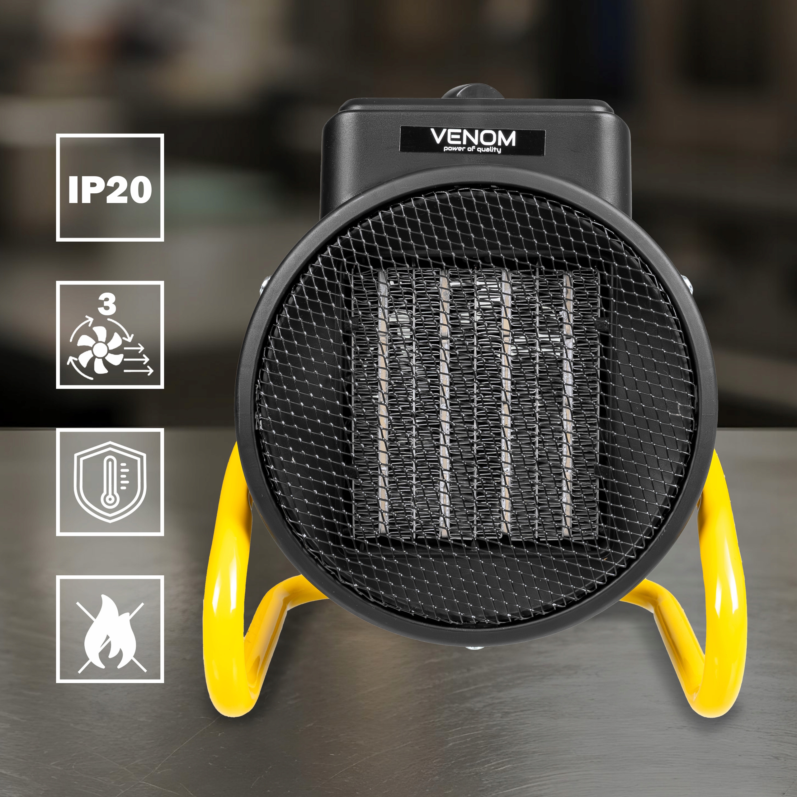 ✅ VENOM HeatFlow 2000™ – nagrzewnica elektryczna o mocy 2000 W, która błyskawicznie podnosi temperaturę w pomieszczeniu, zapewniając szybki komfort cieplny.