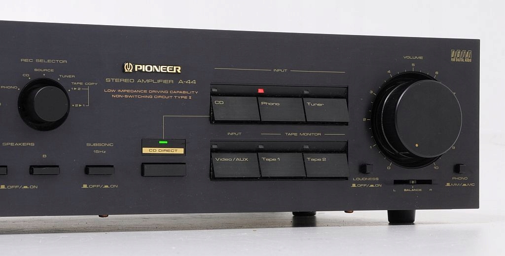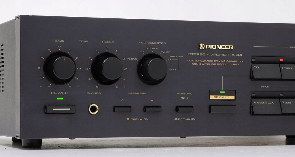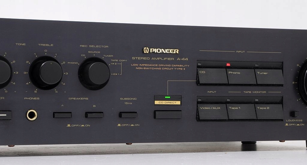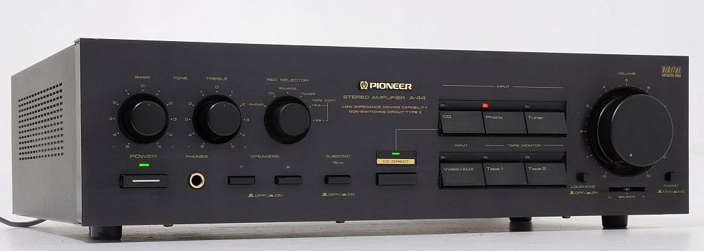 Oferowane urządzenie to znany z dawnych półek sklepowych Pioneer A-44 to tzw. średnia klasa budżetowa, łącząca w sobie doskonałe parametry i solidność wykonania. Budowa wzmacniacza – oparta na tranzystorach, kondensatorach ELNA, potencjometrach ALPS, całość zasilana solidnym transformatorem (Bando). Oferowany A-44 pochodzi z macierzystych zakładów w Japonii, czołówka wykonana z aluminium. Wzmacniacz nie był katowany, nie ma za sobą ciężkich przeżyć co z pewnością przyszły nabywca usłyszy i zobaczy. Zachęcam do zakupu, maszyna pochodzi z porządnej linii, ogólnie wiadomo - „kanciaki” najlepsze (nie tylko w przypadku marki Pioneer:)