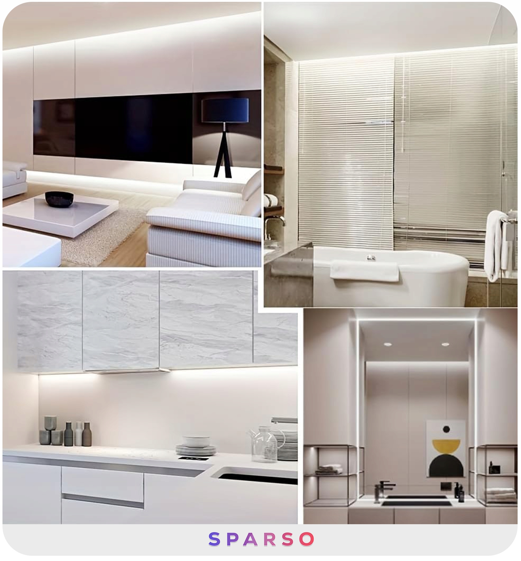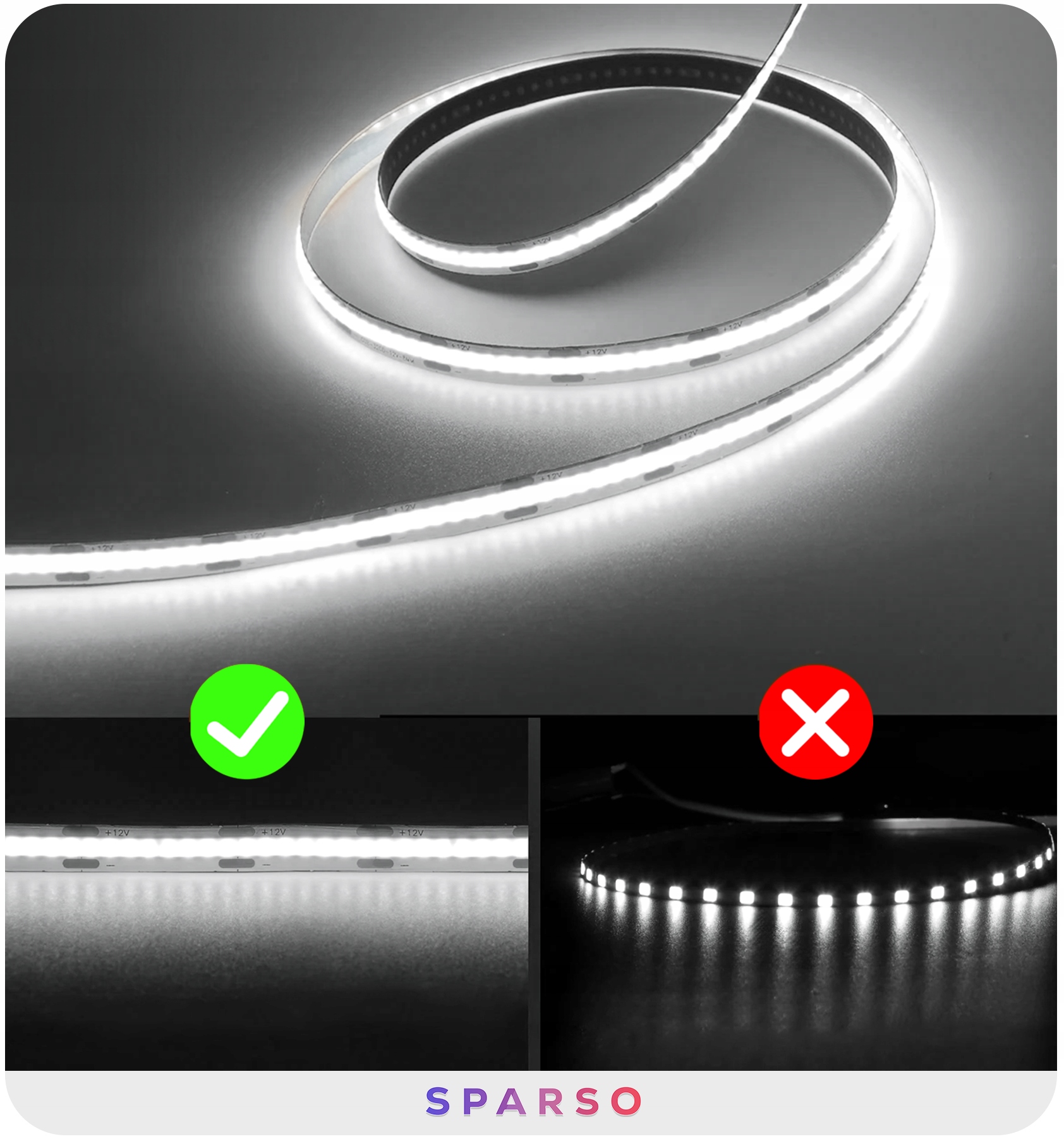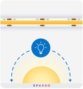 Taśma LED COB marki Sparso świeci pod szerokim kątem 180°, co zapewnia równomierne oświetlenie całej powierzchni. Światło rozchodzi się płynnie, bez cieni i ostrych przejść.
