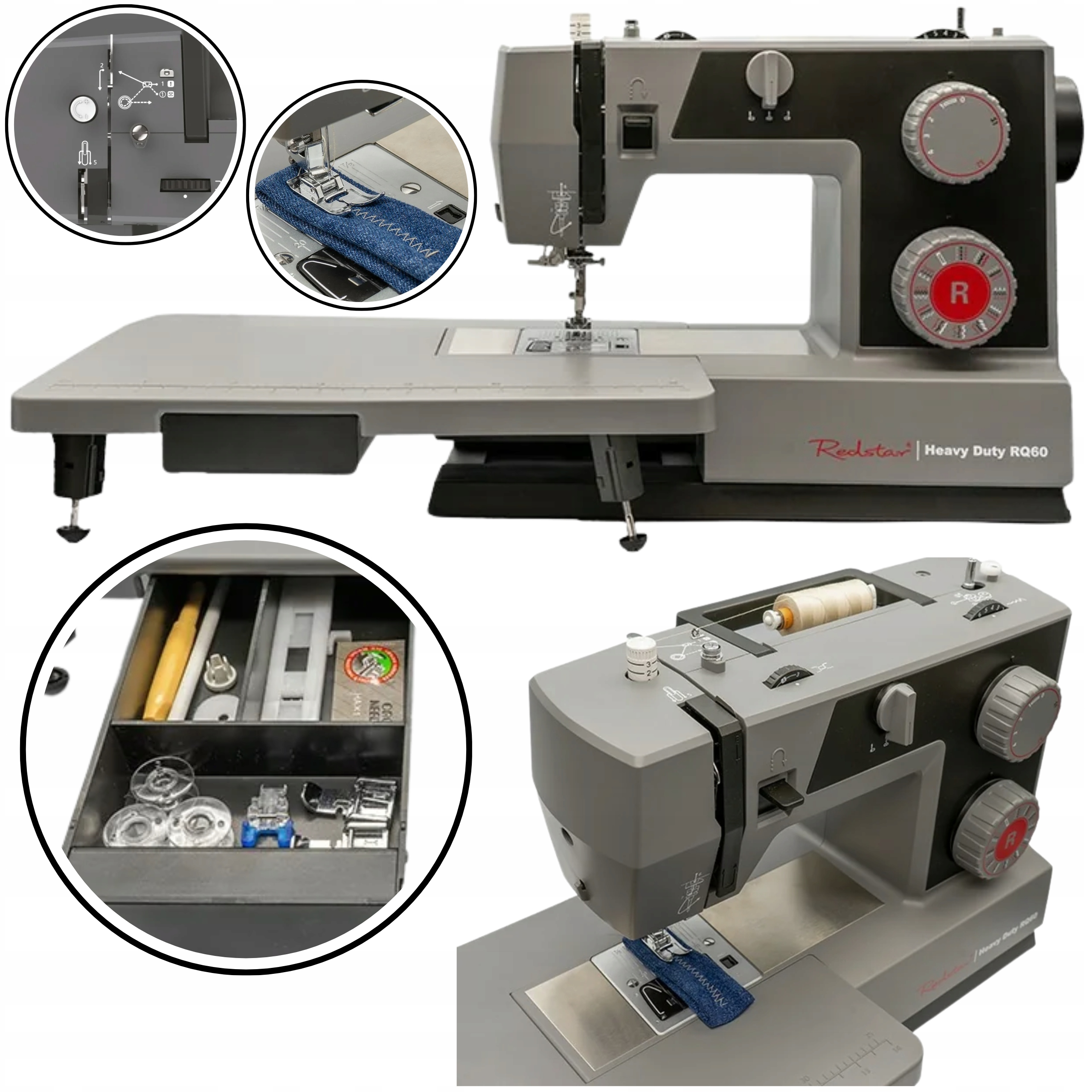Maszyna do szycia Redstar RQ60 Heavy Duty charakteryzuje się długoletnią „żywotnością” i dużą szybkością pracy. Płyta nośna maszyny jest wykonana z metalu. Posiada 32 rodzaje ściegów. Wśród nich znajdziemy automatyczne obszywanie dziurek na wymiar guzika oraz ściegi do podszywania ślepego. Do wyboru mamy także szeroką gamę ściegów owerlokowych i specjalistycznych do różnych typów materiałów, w tym elastycznych. Maszyna do szycia Redstar RQ60 Heavy Duty jest wyposażona w nowoczesny chwytacz rotacyjny. Wzbogacono ją o oświetlenie LED i automat do nawlekania igły. Dodatkowy stolik, który znajduje się w wyposażeniu zwiększa komfort pracy oraz powierzchnię szycia.