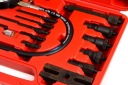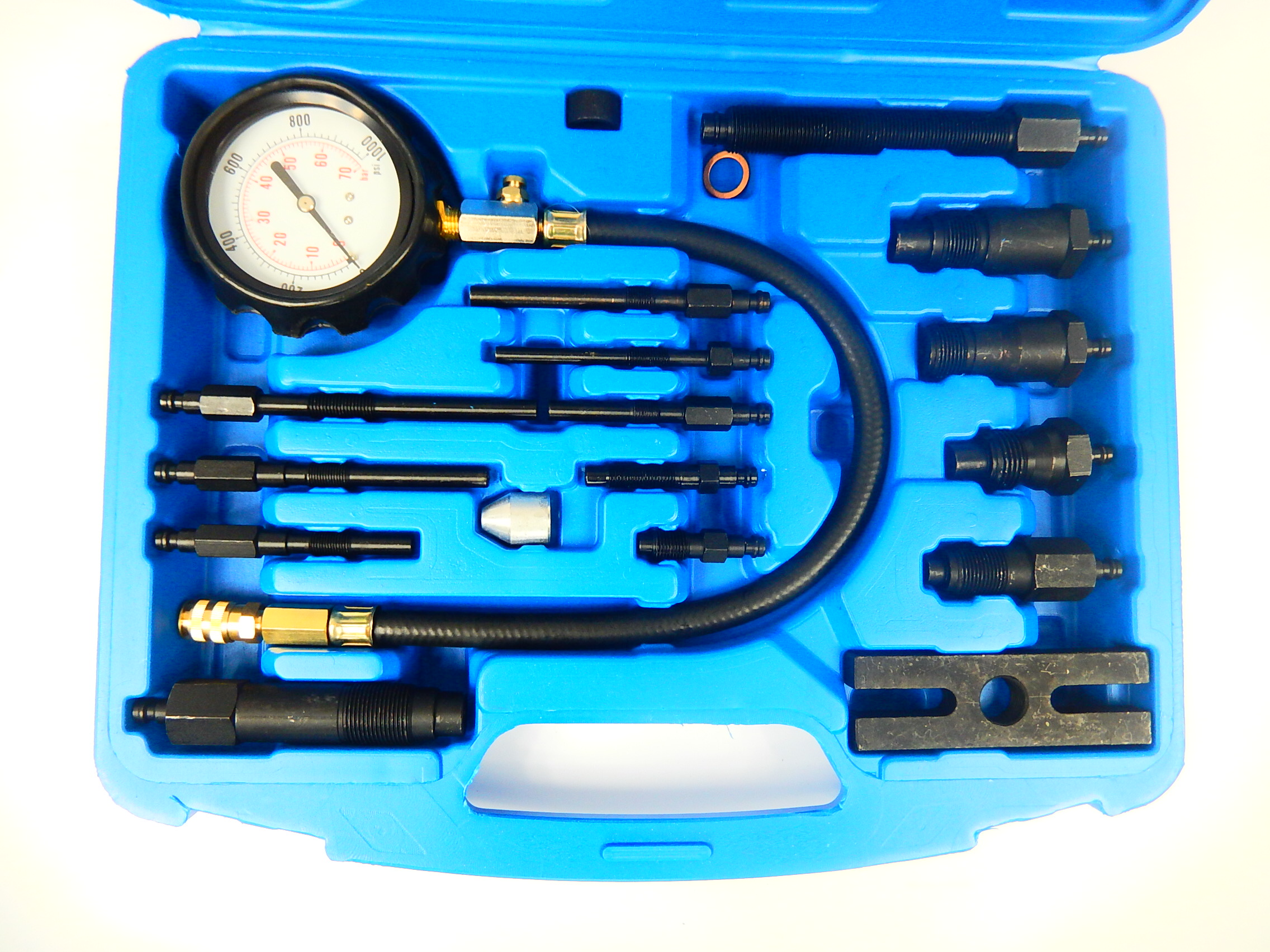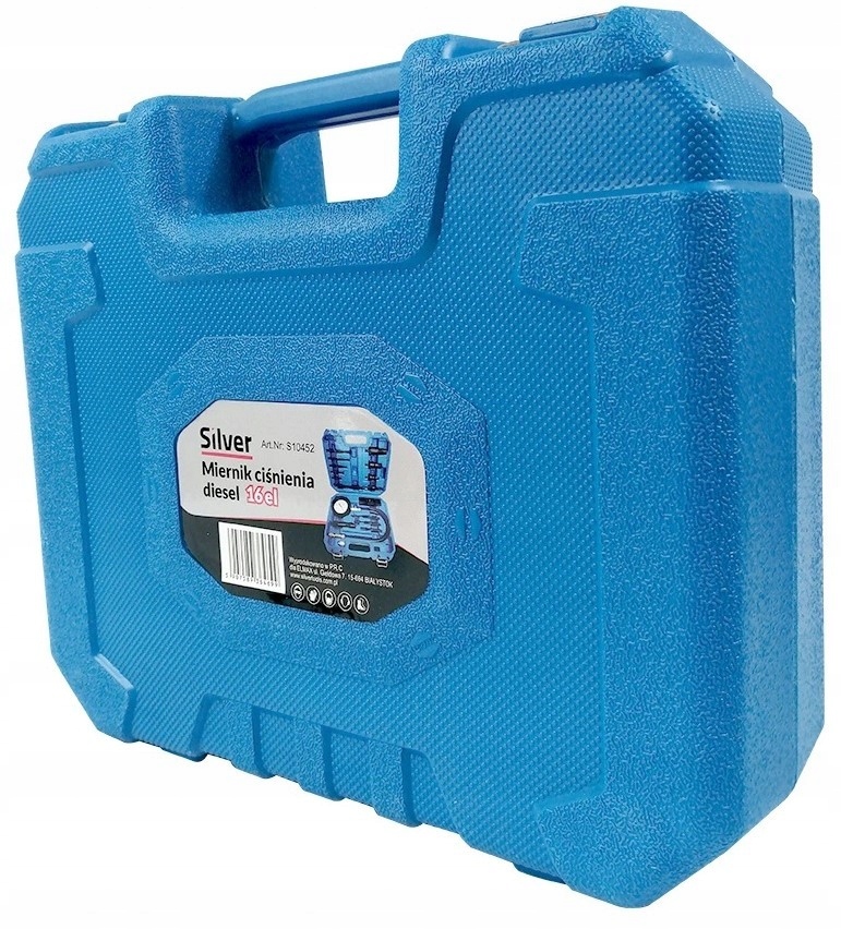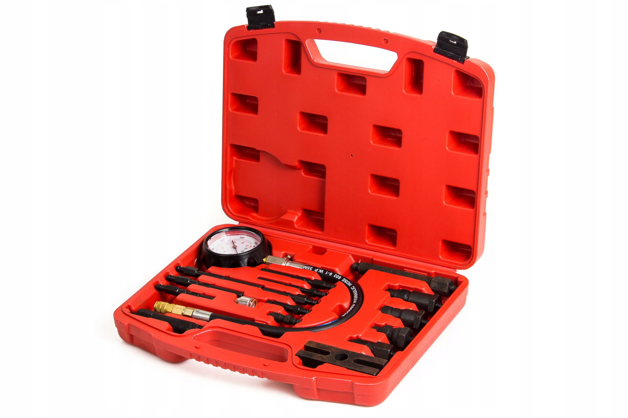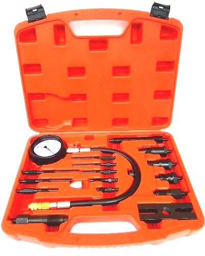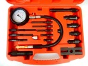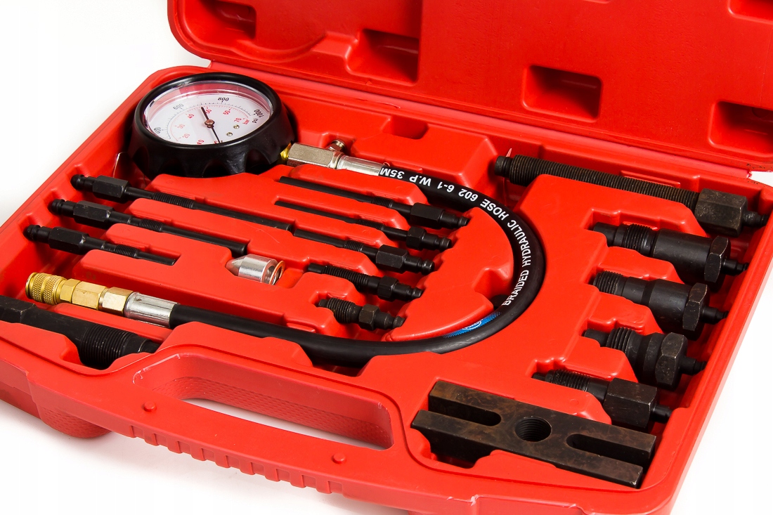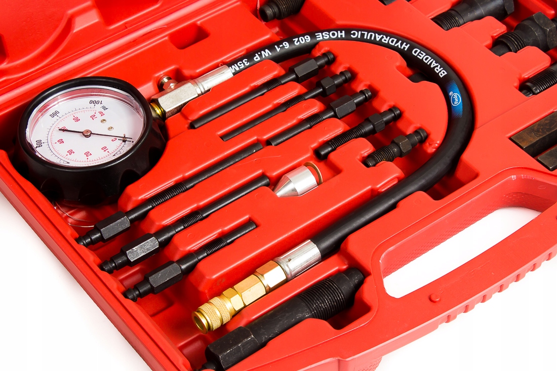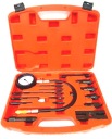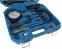 Tester do kontroli ciśnienia sprężania w cylindrach silników diesel z wyposażeniem poszerzającym jego możliwości. W walizce plastikowej znajduje się manometr z zaworem, przedłużka prosta i zagięta, przedłużający wąż ciśnieniowy oraz adaptery do podłączenia do cylindrów.