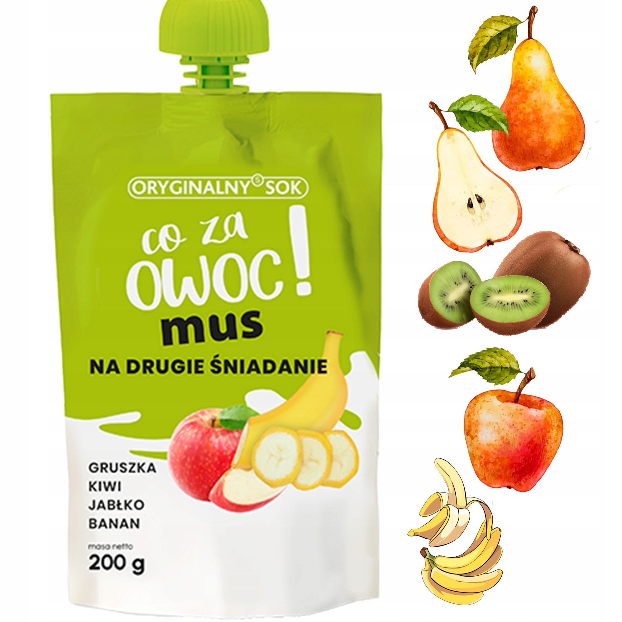 OryginalnySok MUS co za owoc 200g to zdrowy, płynny posiłek dla małego i dużego. Wykonany z przecierów ma gęstą konsystencję i bogaty aromat. Połączenie słodkiej gruszki, kiwi, jabłka i banana to naturalna i bez cukrowa alternatywa dla słodyczy. Wszystko zamknięte w zgrabnym opakowaniu można zabrać ze sobą do szkoły, na podwórko lub na spacer oraz podczas aktywności fizycznej.