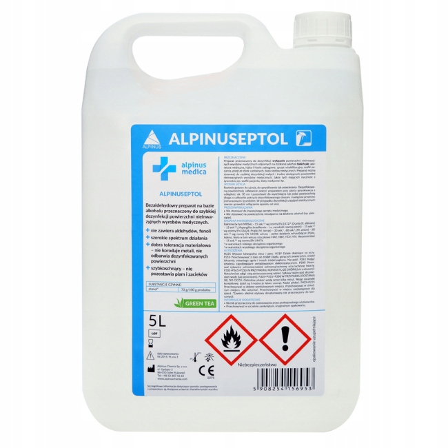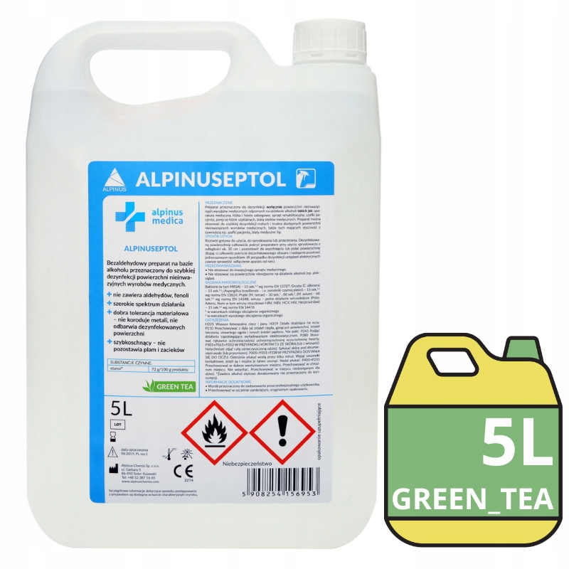 ALPINUSEPTOL GREEN TEA 5L to profesjonalny preparat dezynfekcyjny dawniej znany jako Mediseptol, wyróżniający się bezaldehydową formułą na bazie alkoholu. Doskonale sprawdza się w szybkiej dezynfekcji różnorodnych powierzchni oraz sprzętu medycznego. Dzięki wszechstronnemu zastosowaniu produkt zyskuje uznanie w wielu branżach, zapewniając skuteczną ochronę i higienę. Zapach neutralny.