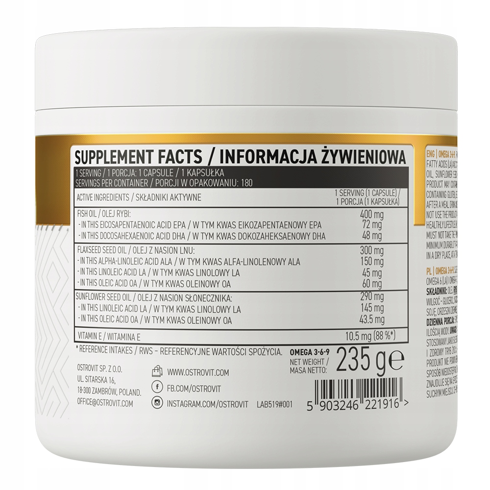 OstroVit Omega 3-6-9-это пищевая добавка, которая является источником ценные ненасыщенные жирные кислоты омега-3, а также омега-6 и омега-9, а также обеспечивают для организма витамин Е. Это препарат в виде легко проглатываемых капсул, который рекомендуется это, в частности, люди, отличающиеся повышенным спросом на перечисленные выше отношения.