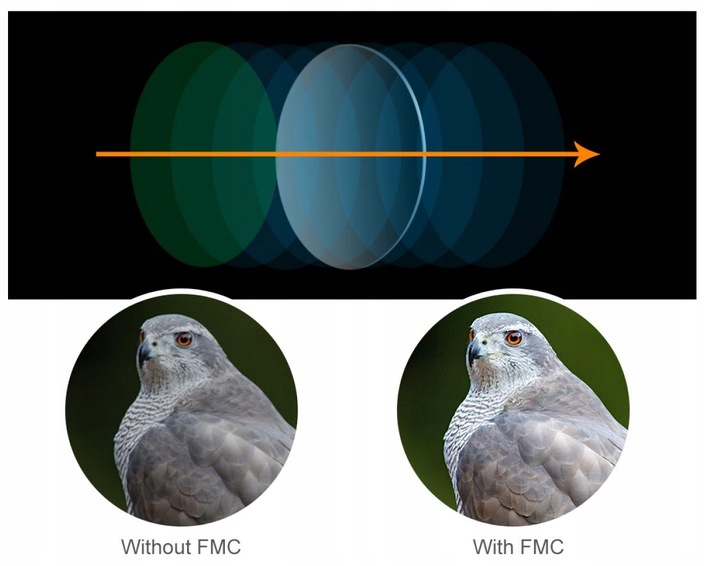 Dodatkowo soczewki pokryte są powłokami antyrefleksyjnymi Multi Coated (FMC) o przepuszczalności światła 98%, które minimalizują niechciane odbicia oraz wpływają pozytywnie na kontrast obrazu.