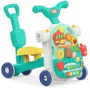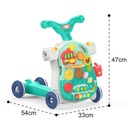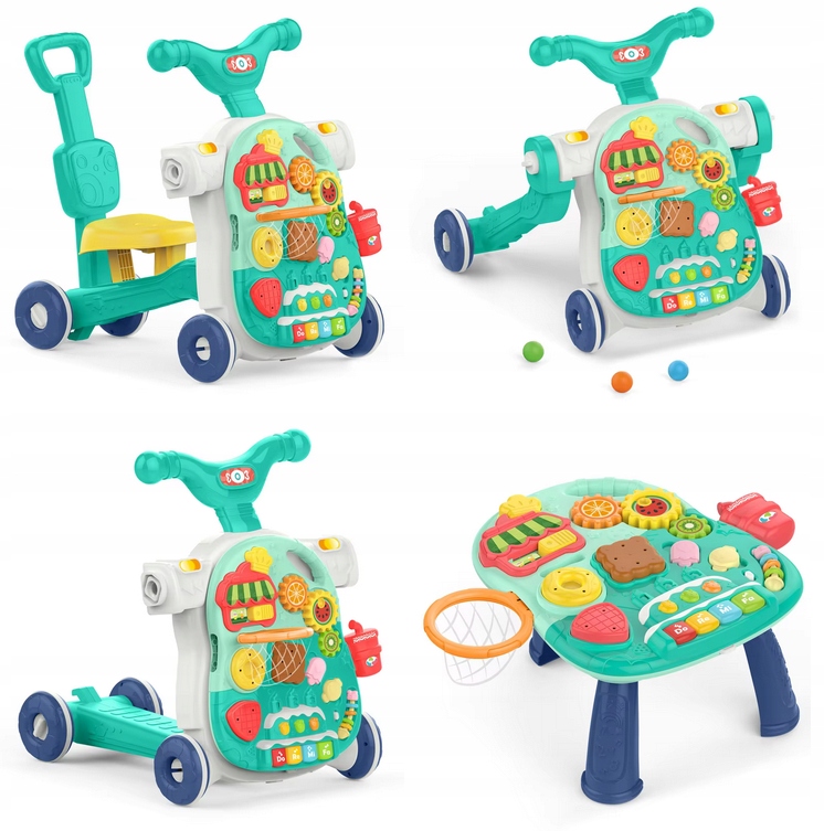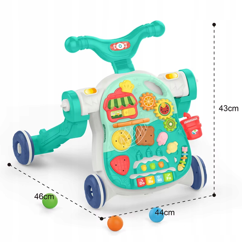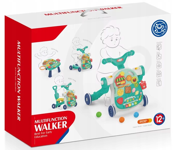 Nasz interaktywny produkt łączy wiele funkcji takich jak: chodzik, pchacz, stolik edukacyjny, zdejmowany panel główny (np. do zawieszenia przy łóżeczku czy oddzielnej zabawy), jeździk, hulajnoga i wiele innych. Produkt przeznaczony dla maluszków już od 12 miesiąca życia. Pchacz jest bardzo pomocny w nauce samodzielnego chodzenia.