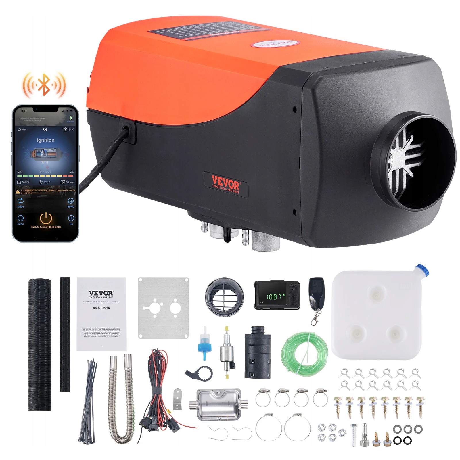 Nowoczesne ogrzewanie postojowe olejowe 8kW 12V z funkcją Bluetooth, pilotem i ulepszonym wyświetlaczem LCD. Cicha praca, niskie zużycie paliwa, automatyczny start i stop. Idealne do pojazdów, kamperów i przestrzeni roboczych.
