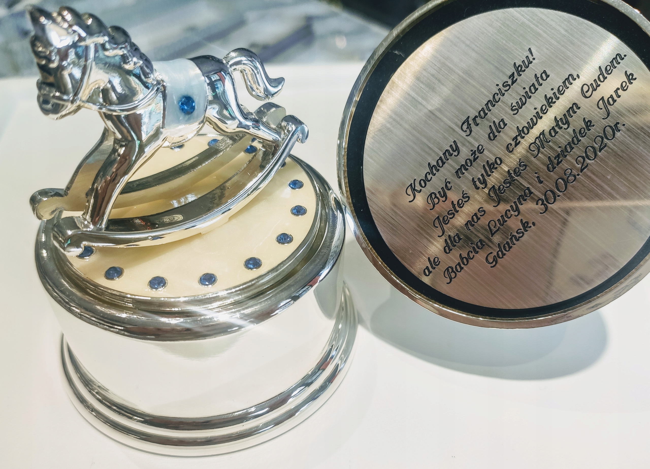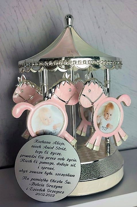 Pozytywka z karuzelą jest idealną pamiątka Chrztu Św. lub prezentem urodzinowym na pierwszy roczek dla chłopczyka. Wykonana jest z emalii, przypominającej masę perłową. Odgrywa wesołą melodię, która ucieszy każde dziecko.