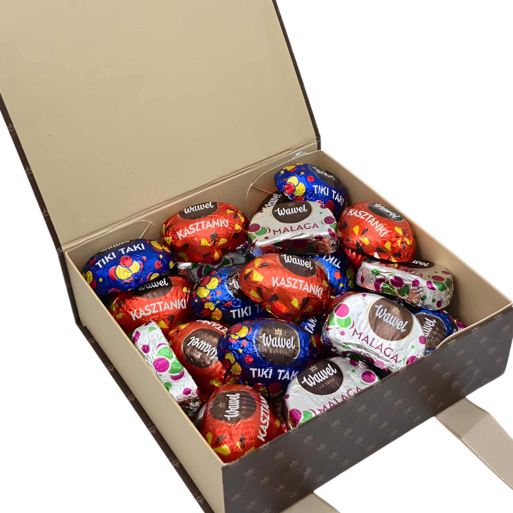 Malaga, Tiki Taki i Kasztanki - trzy ponadczasowe klasyczne czekoladki, które najlepiej smakują razem. Każda z nich ma swój unikalny charakter, dopiero wspólnie tworzą spójną całość, której trudno się oprzeć. Malaga zachwyca delikatnym, alkoholowym nadzieniem z rodzynkami, Tiki Taki kuszą kokosowym wnętrzem z nutą orzechowego kremu, a Kasztanki oferują intensywne połączenie deserowej czekolady, kakao i chrupiących wafelków.