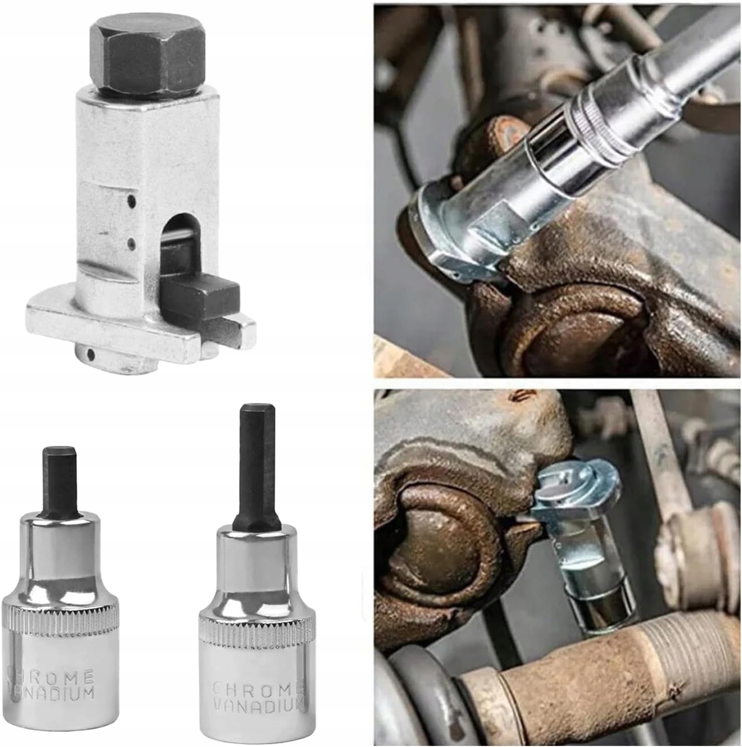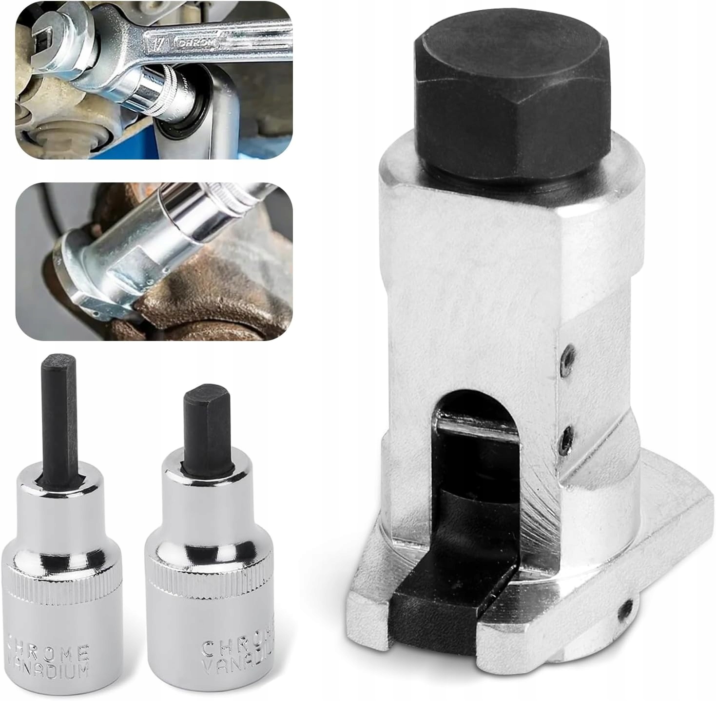 Zestaw specjalnych kluczy nasadowych przeznaczonych do montażu i demontażu łączników stabilizatora oraz mocowań amortyzatorów. Dzięki precyzyjnemu dopasowaniu narzędzia minimalizują ryzyko uszkodzenia piasty i zapewniają szybkie oraz bezpieczne odkręcanie elementów nawet w trudno dostępnych miejscach.