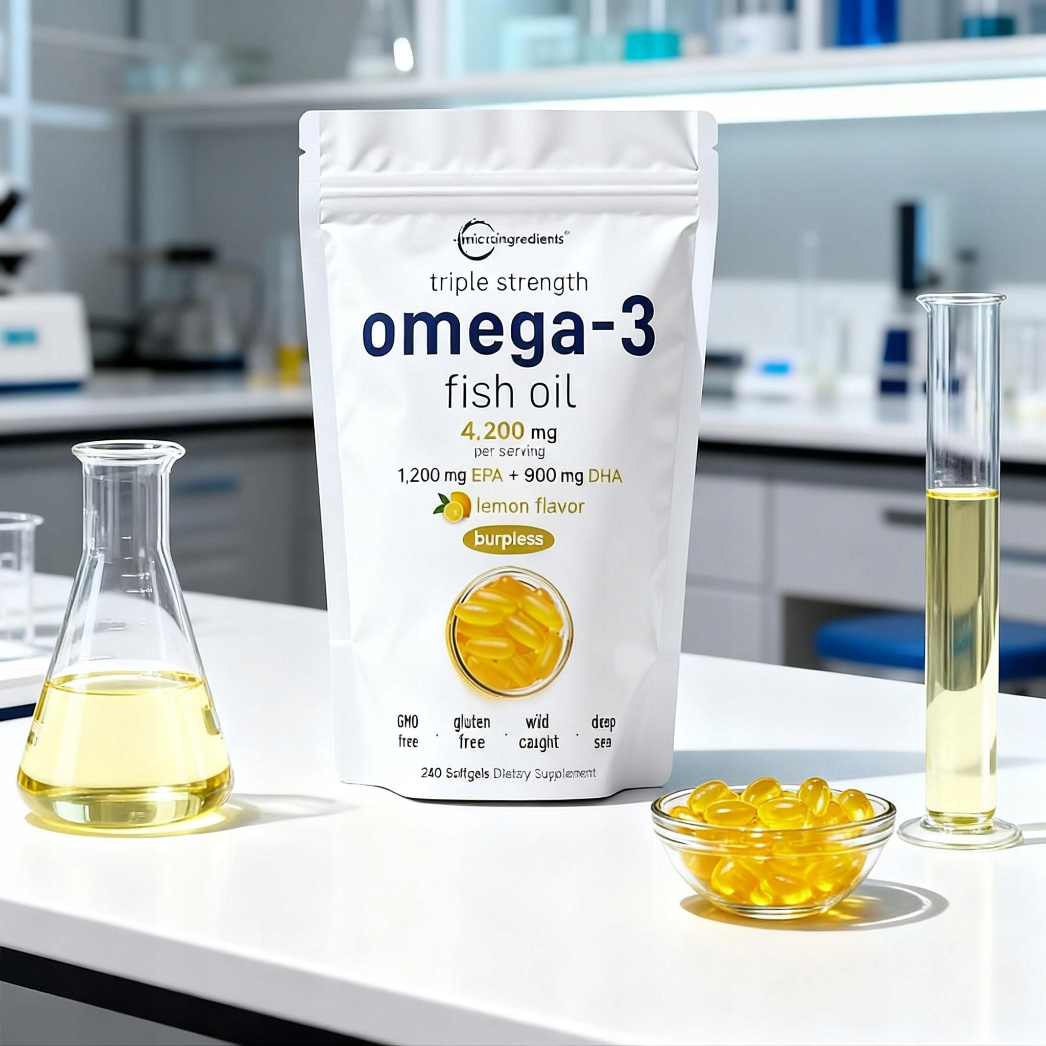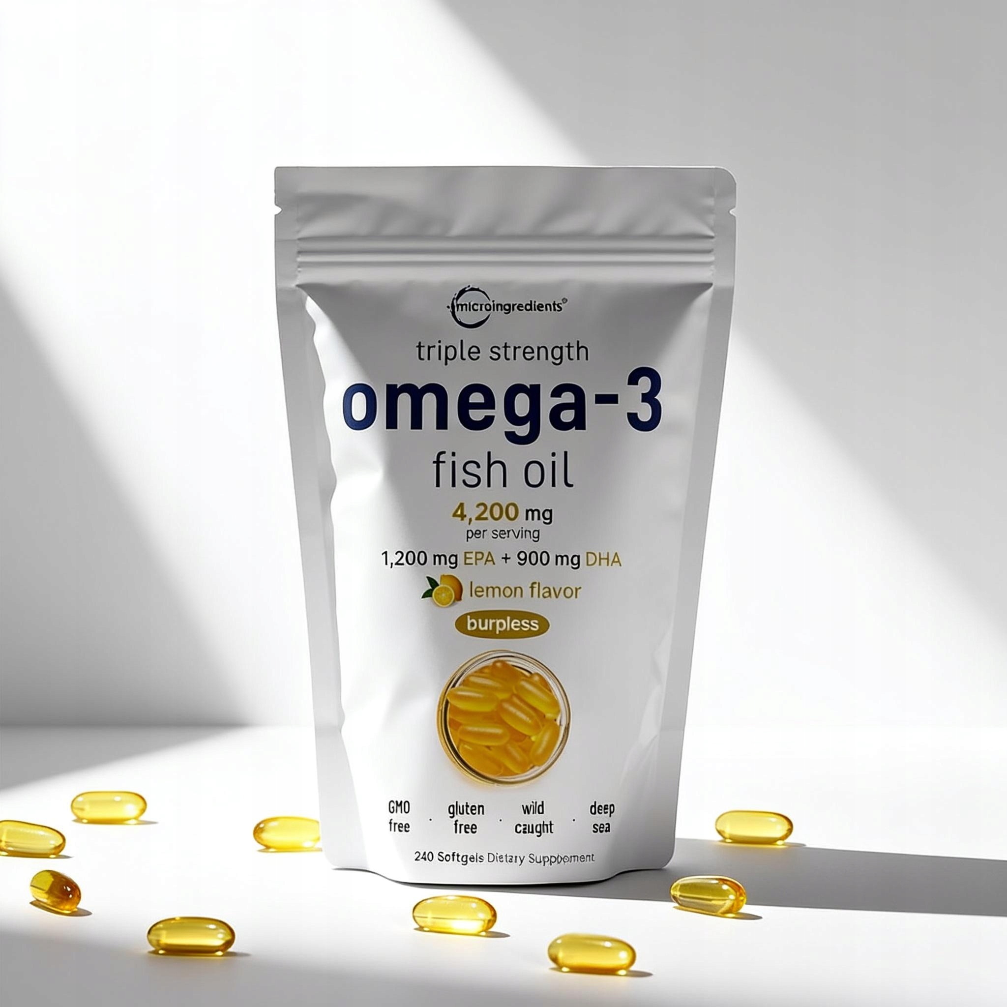 Micro Ingredients oferuje potrójną siłę 4,200mg omega-3 olej rybny softgels. Nasycony słodkim cytrynowym smakiem i wykonany w technologii bez bekania powlekanej dojelitowo. Zachowuje wysoki poziom EPA DHA z dziko złowionych norweskich świeżych ryb.
