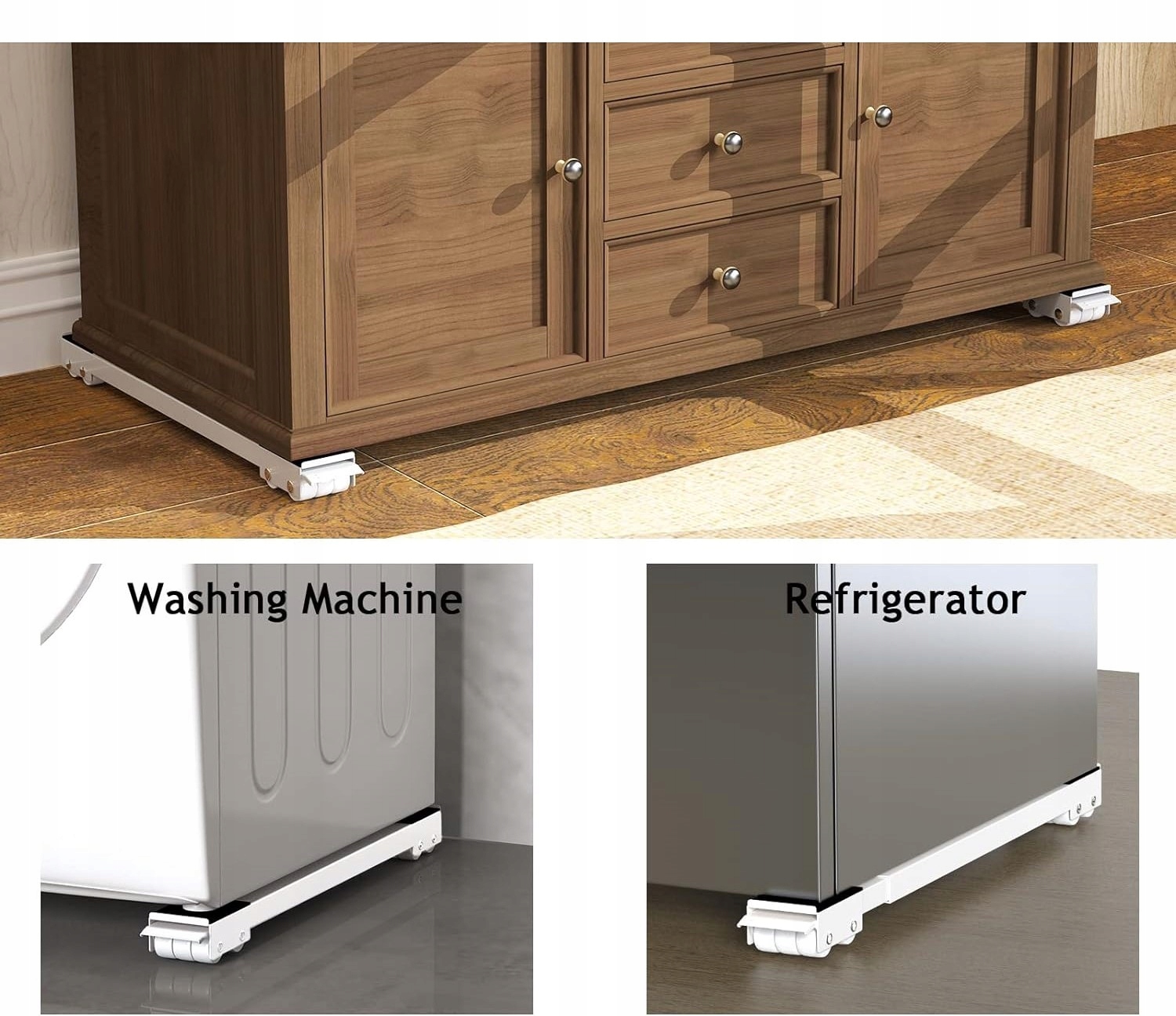 Regulowany wózek meblowy: dwurzędowa prosta konstrukcja, niewymagająca instalacji. Długość można łatwo regulować w zakresie 44,5–72 cm, co daje wystarczającą swobodę do ustawienia wózka pod meblami o różnych rozmiarach, takimi jak lodówka, pralka, suszarka bębnowa itp.