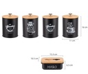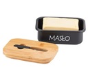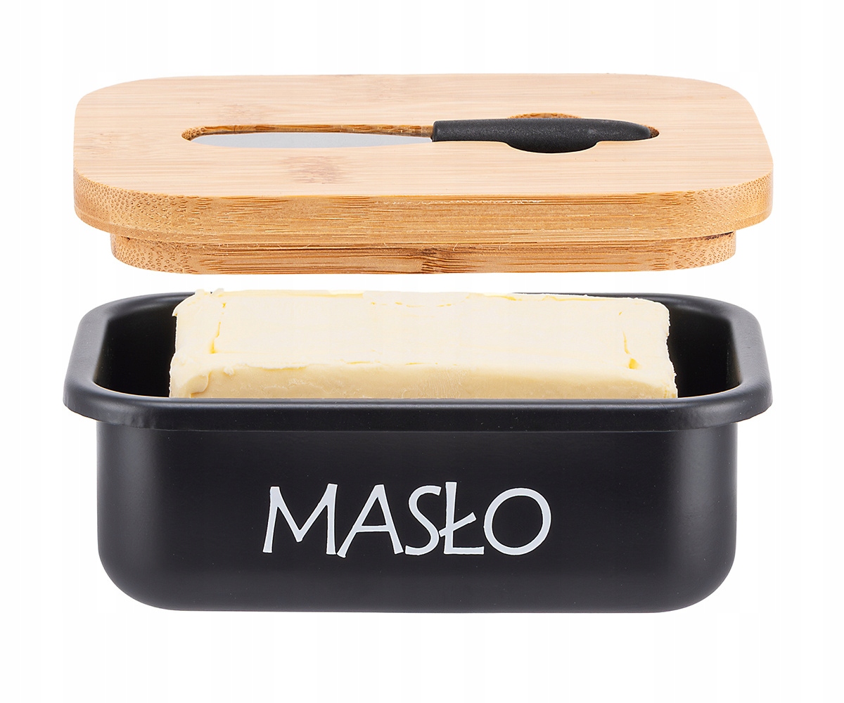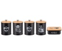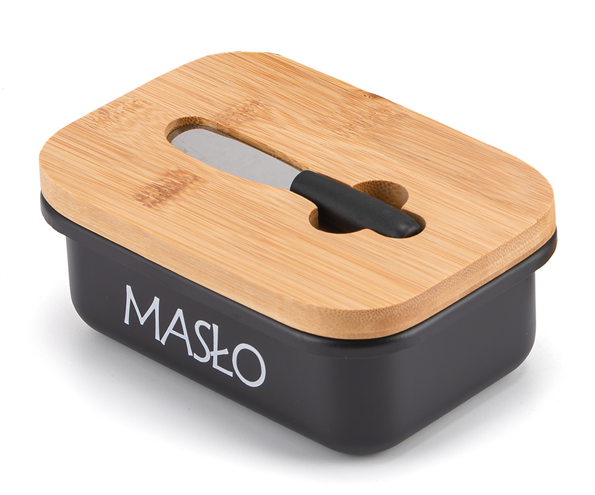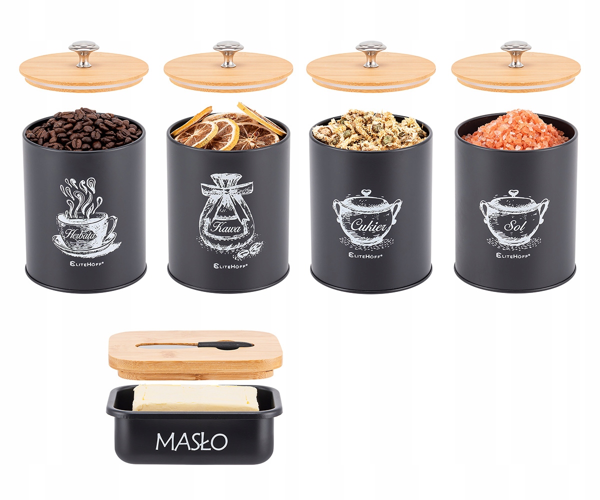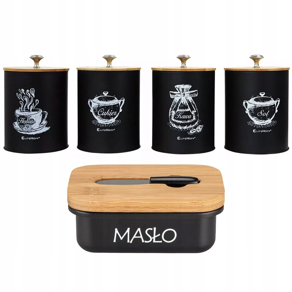 Pojemniki kuchenne zostały zaprojektowane tak, aby spełniać wszystkie potrzeby Twojej kuchni. Są odporne na uszkodzenia mechaniczne oraz łatwe do utrzymania w czystości.Wykonane z metalu malowanego proszkowo na kolor czarny. Pokrywy wykonane z drewna bambusowego. W pokrywie maselniczki nożyk do smarowania umieszczony w wyprofilowanym zagłębieniu.