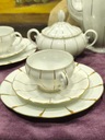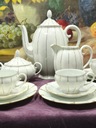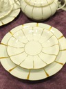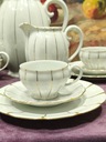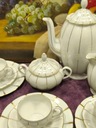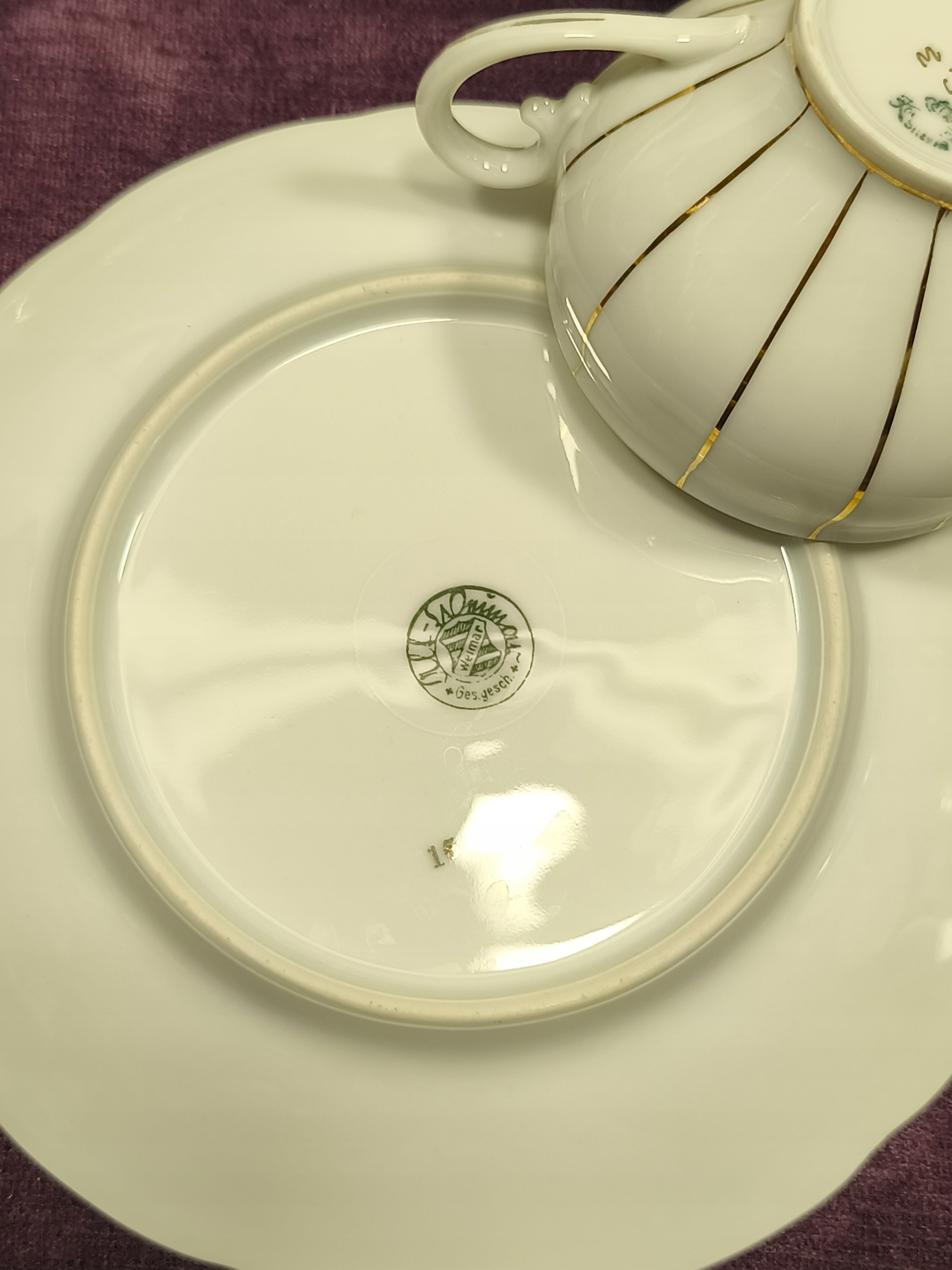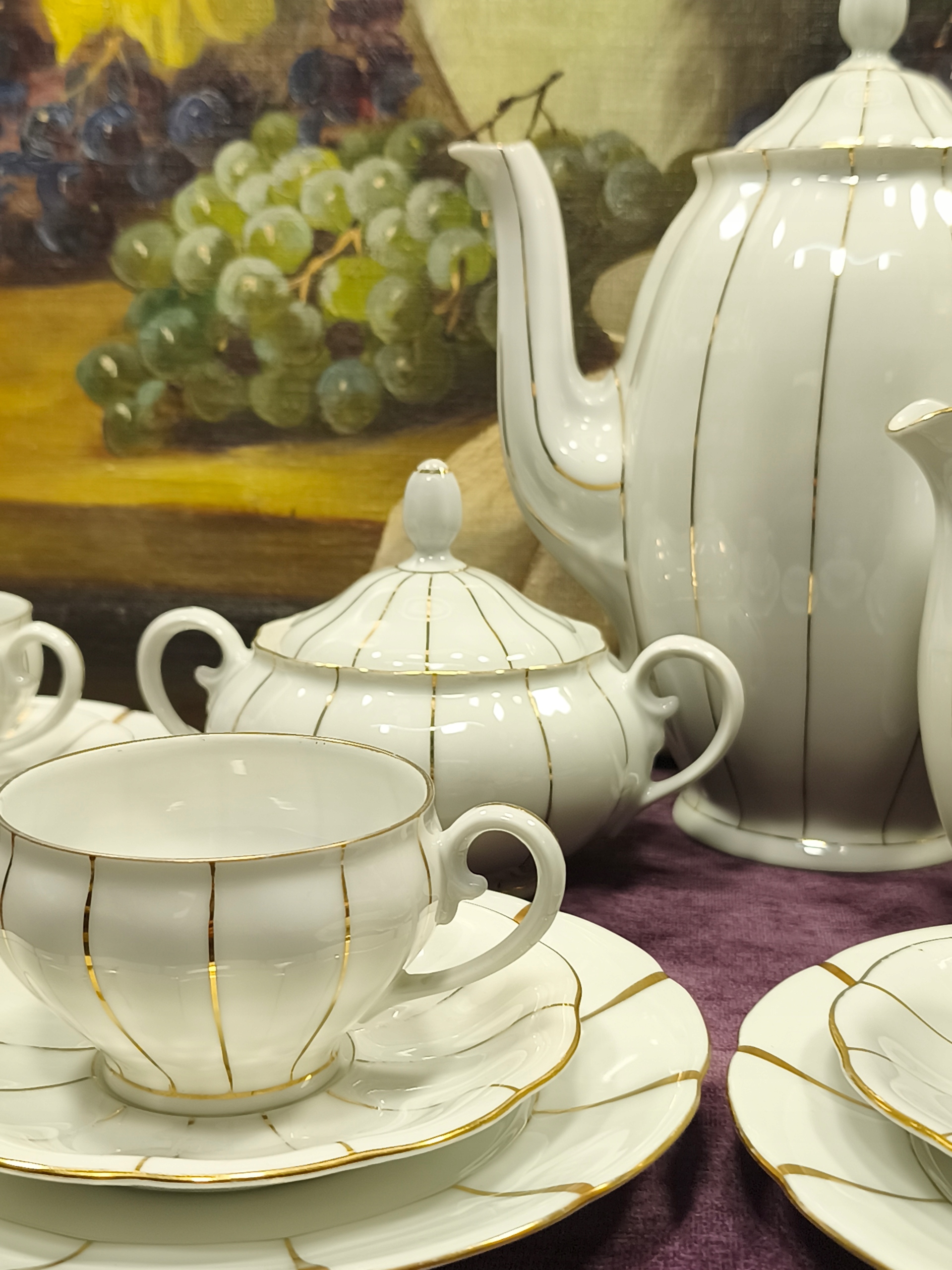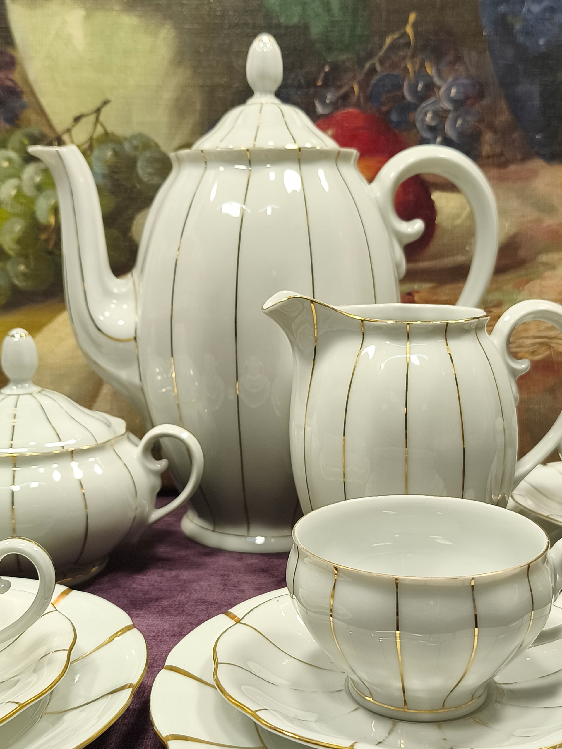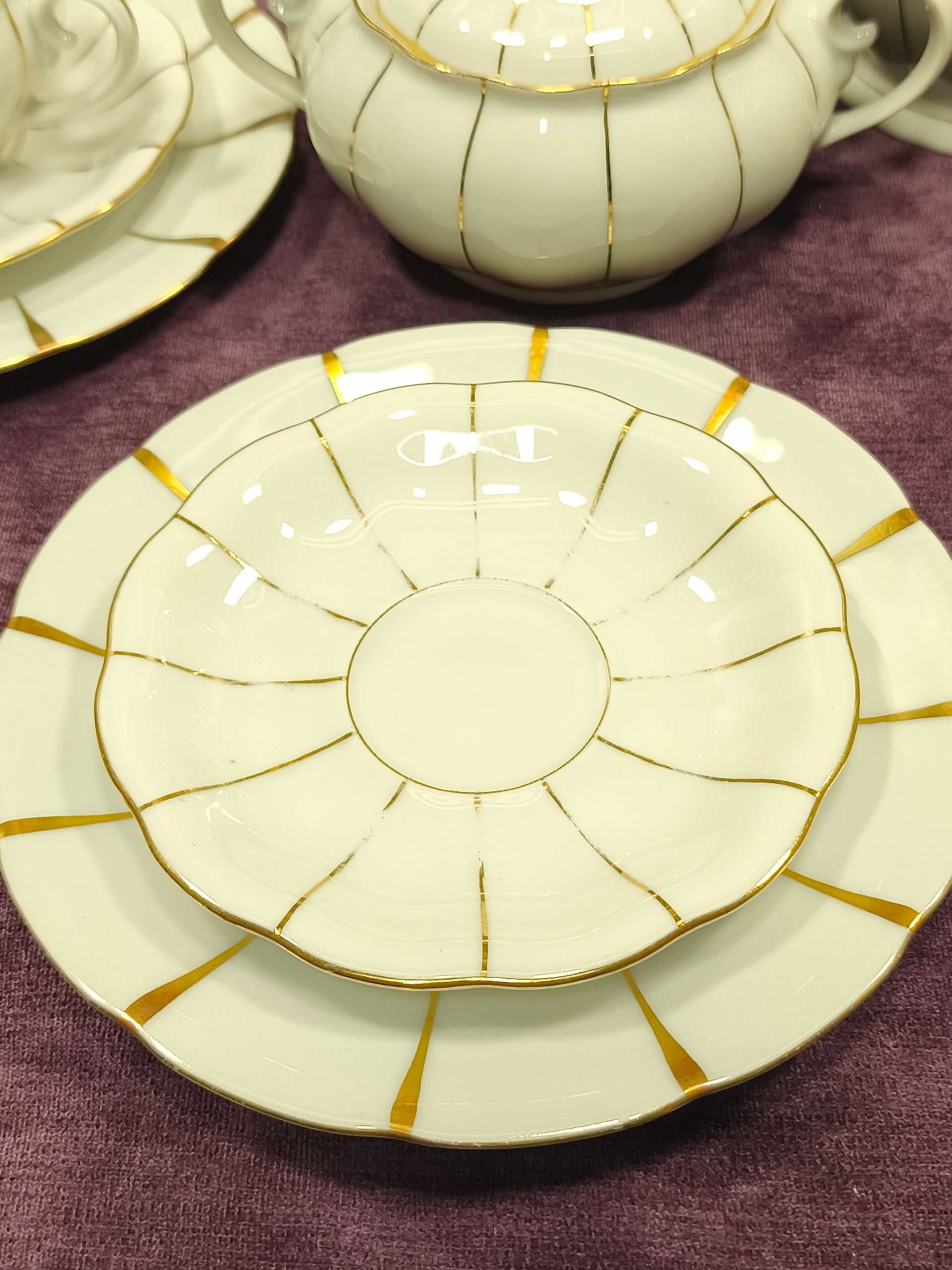 Bardzo elegancki,klasyczny w formie i zdobieniu serwis do kawy kompletny dla 4 osób,cenionej i kolekcjonowanej przedwojennej śląskiej wytwórni porcelany Koenigszelt obecnej Jaworzynie Śląskiej.Sygnatura z okresu 1922-1930.Biała porcelana że złotym zdobieniem,są przetarcia na podstawkach.Talerzyki deserowe z innej manufaktury.Duży dzbanek z pokrywką o wysokości 27.5cm, cukiernica z pokrywką, mlecznik, 4 filiżanki o wysokości 6cm i średnicy wlewu 8.5cm,4 podstawki 14cm oraz 4 talerzyki deserowe o średnicy 19.5cm.Polecam. Dostępne także kompletne serwisy do kawy i obiadu z wytwórni Koenigszelt w innych fasonach i dekoracjach.