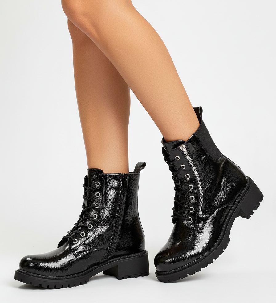 Czarne damskie ocieplane botki typu glany, zwane również workerami, to propozycja dla kobiet ceniących połączenie stylu, wygody i funkcjonalności. Wykonane z wysokiej jakości lakierowanej skóry ekologicznej prezentują się wyjątkowo efektownie – ich połyskująca powierzchnia dodaje charakteru każdej stylizacji, podkreślając indywidualny styl i pewność siebie. To idealny wybór dla kobiet, które lubią łączyć klasyczną czerń z nowoczesnym, miejskim designem.