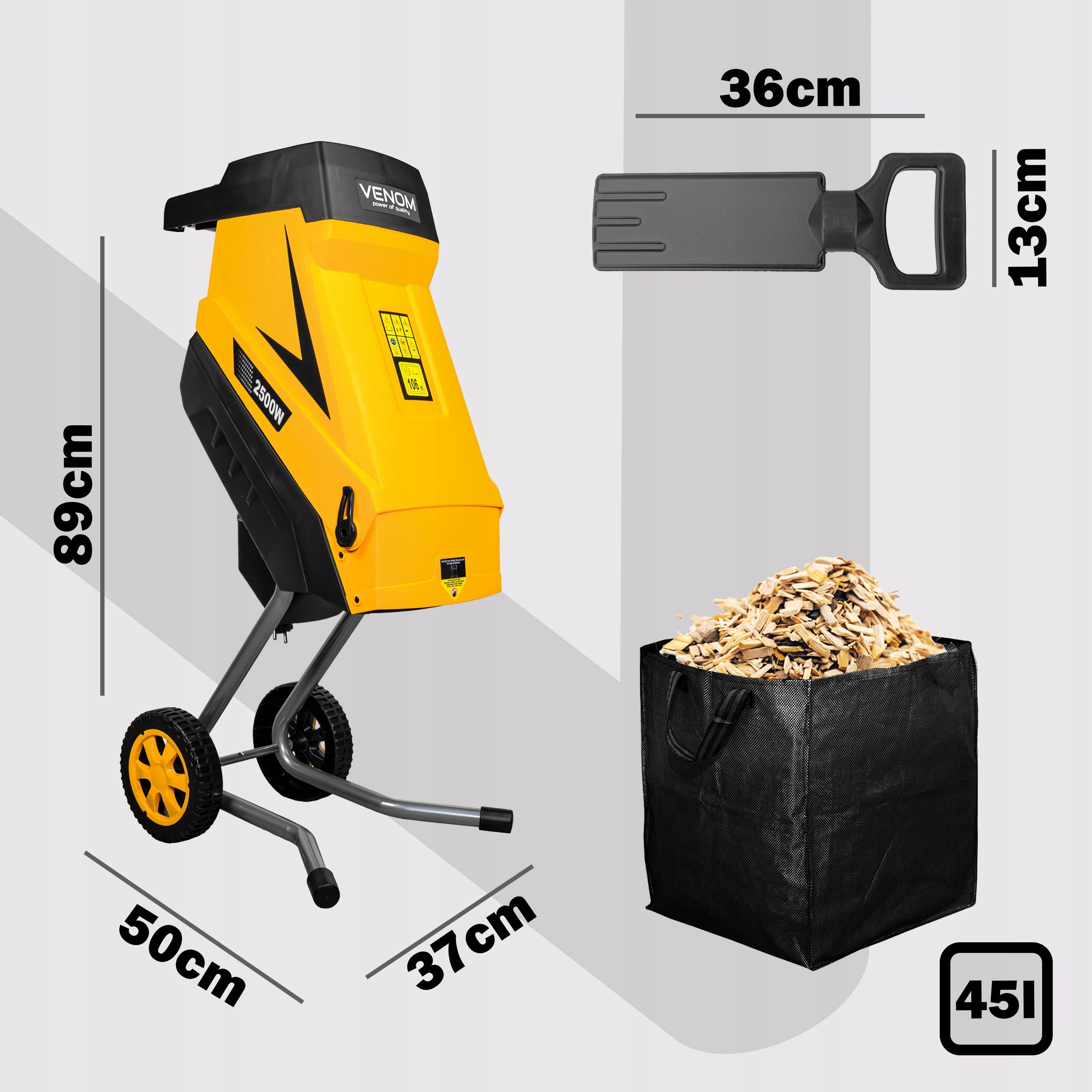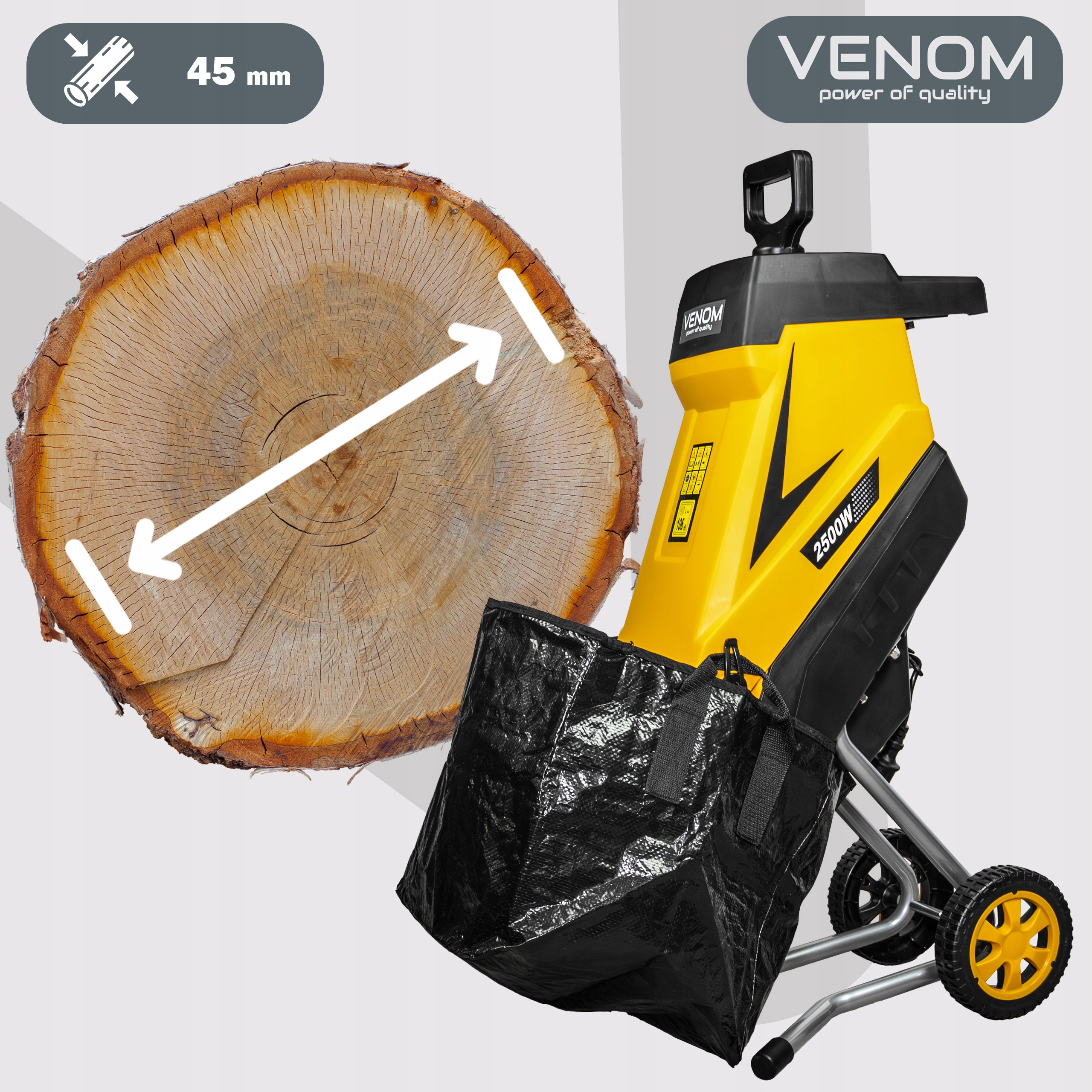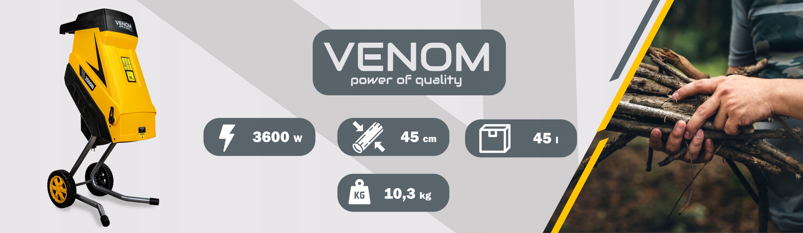 Decydując się na rozdrabniacz VENOM, otrzymujesz kompletny, profesjonalny zestaw, który pozwala na natychmiastową i komfortową pracę – bez ukrytych kosztów i bez konieczności dokupywania akcesoriów!