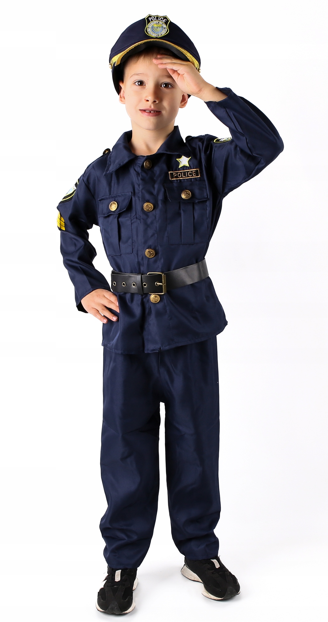 В комплект входит рубашка с нашивками и полицейскими принтами, а также декоративные пуговицы. Длинные брюки имеют вшитую резинку и петли, поддерживающие ремень, который вместе с крышкой они подчеркивают подлинность наряда.