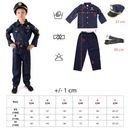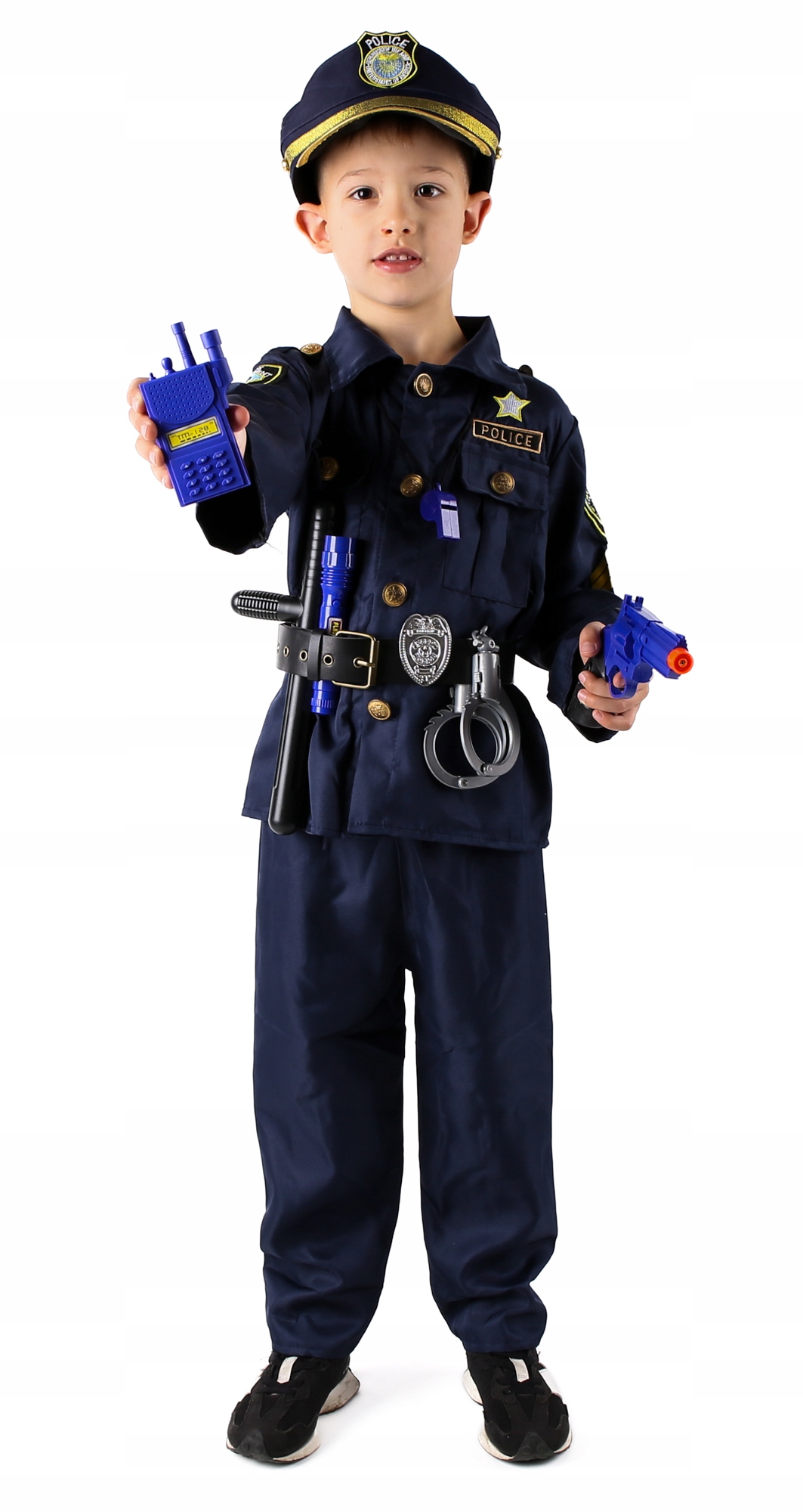 Zestaw obejmuje koszulę z naszywkami i nadrukami policyjnymi wraz z ozdobnymi guzikami. Długie spodnie posiadają wszytą gumkę ściągającą oraz szlufki podtrzymujące pasek, który wraz z czapką podkreślają autentyczność stroju.
