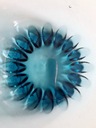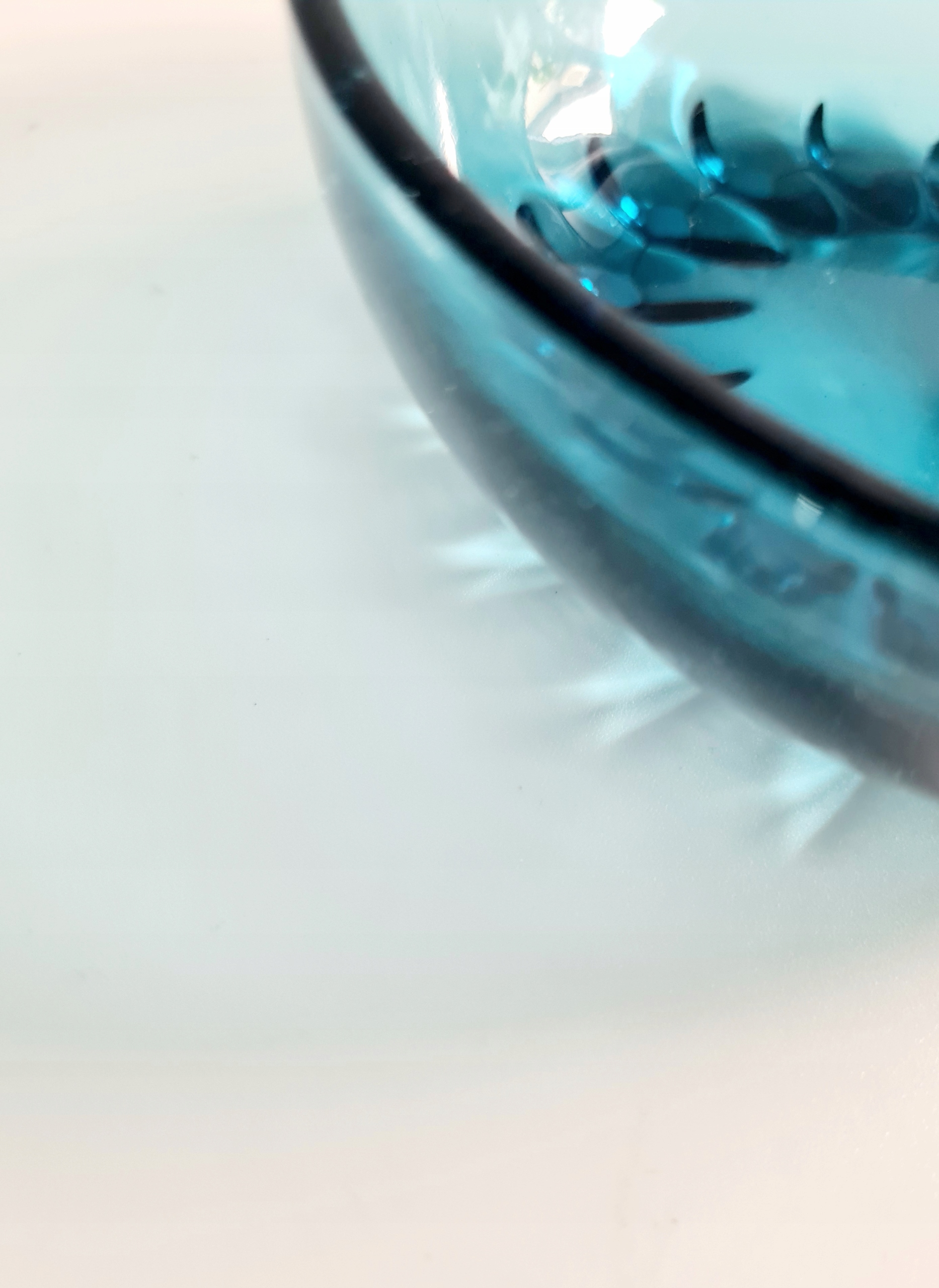 Rzadko spotykane na rynku trzy miseczki wyprodukowane w HSG Ząbkowice, w katalogach huty z początku lat 70 jest to wzór nr 7012. Projekt: Jan Sylwester Drost z 1969. Piękny, nasycony niebieski kolor.