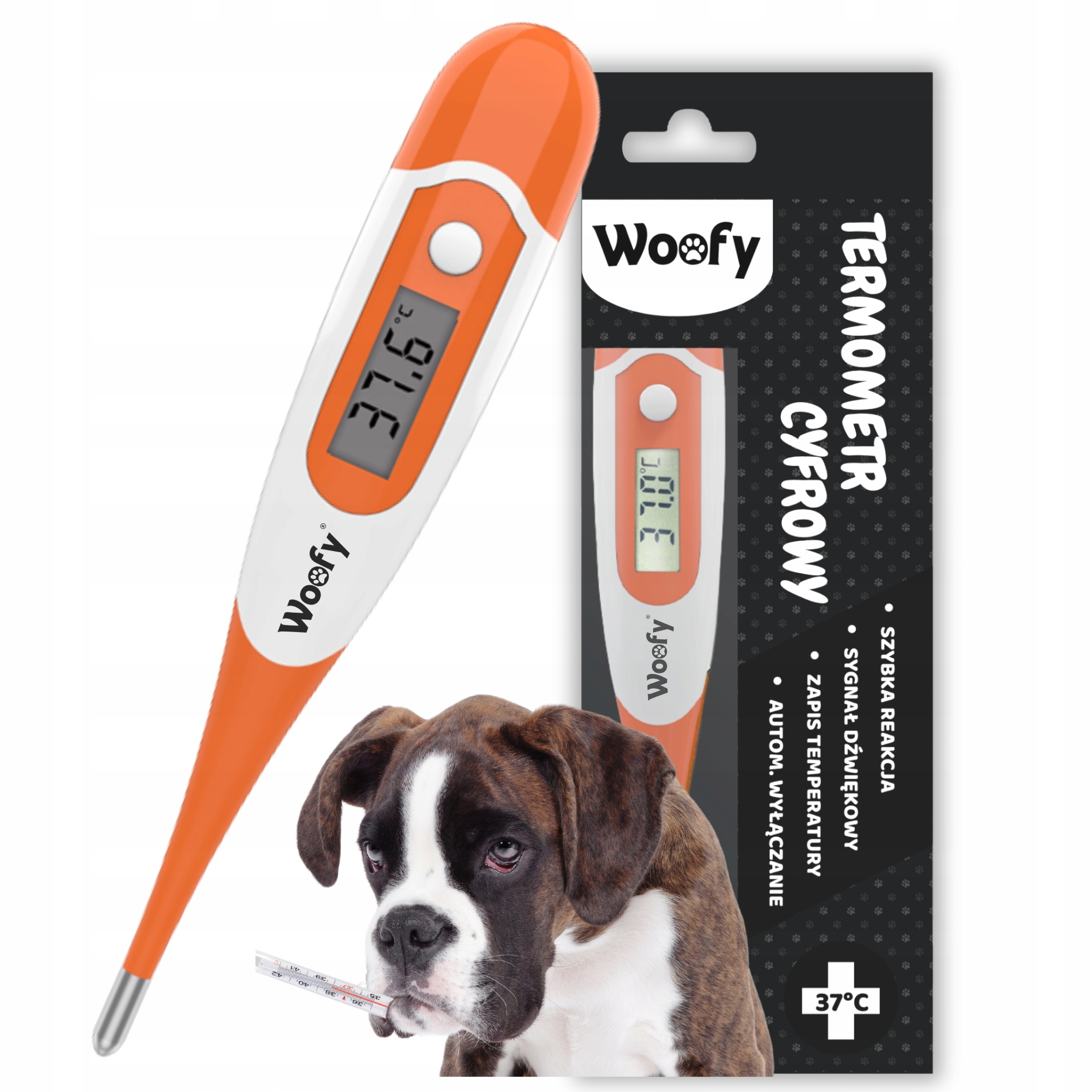 Termometr Woofy® to precyzyjne urządzenie diagnostyczne stworzone specjalnie do pomiaru temperatury ciała zwierząt domowych i hodowlanych.