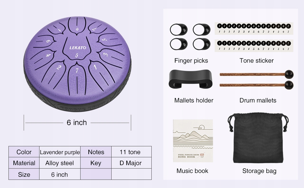 Lekato Steel Tongue Drum został wyposażony w 11 nuty, aby zapewnić szerszą gamę dźwięków do grania muzyki. 6-calowy bębenek językowy może wytworzyć czysty i eteryczny dźwięk, uzdrawiać umysł i zredukować stres. Kompaktowy rozmiar i kilka Kkolory, bardzo Nadaje się jako idealny prezent dla dzieci, aby wzbudzić zainteresowanie muzyką. Weź bijak w dłoni i rozpocznij nasze kręgi muzyczne!