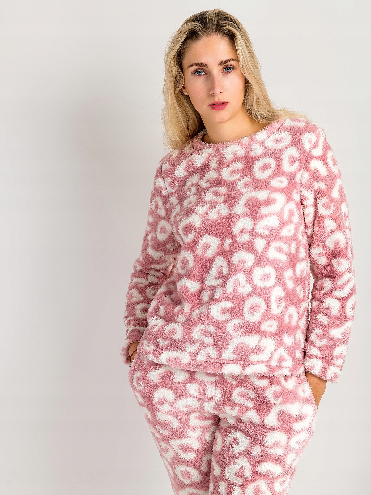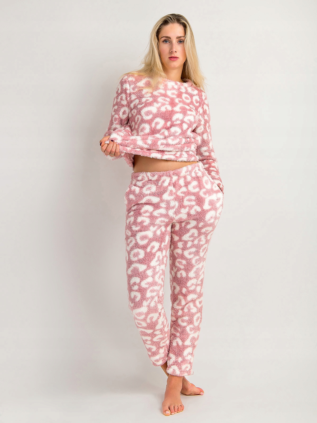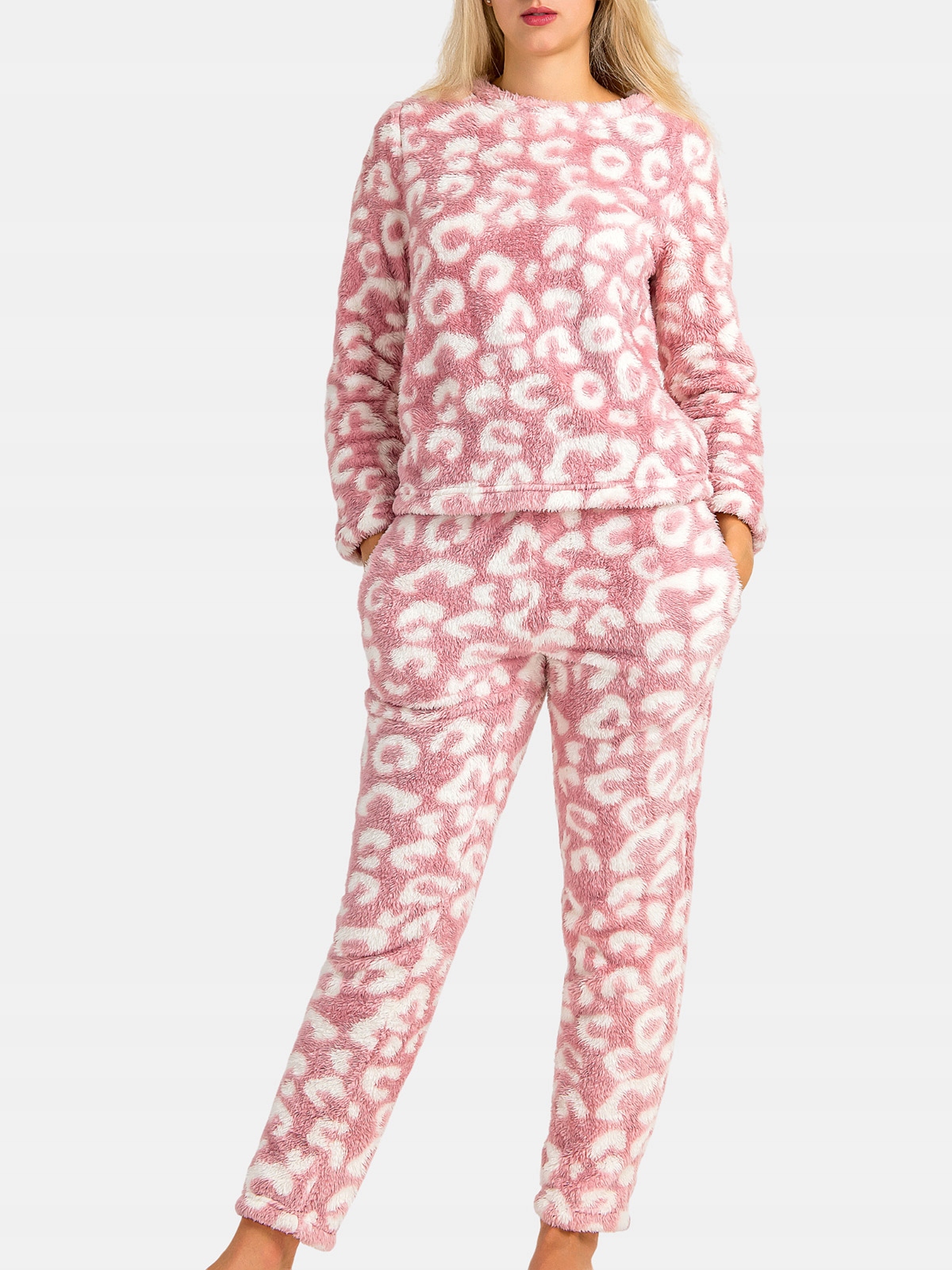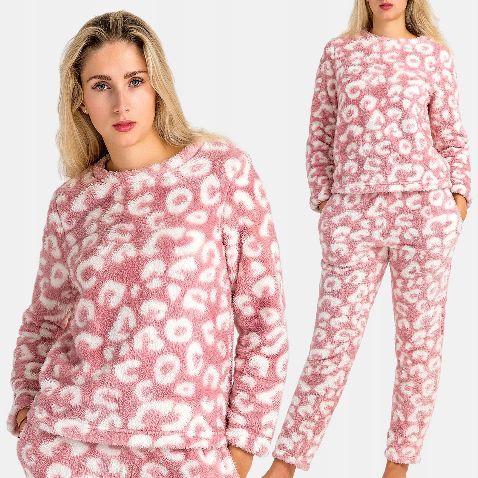 Piżama Damska Dwuczęściowa Gruba Ciepła Pluszowa w Cętki Różowa M