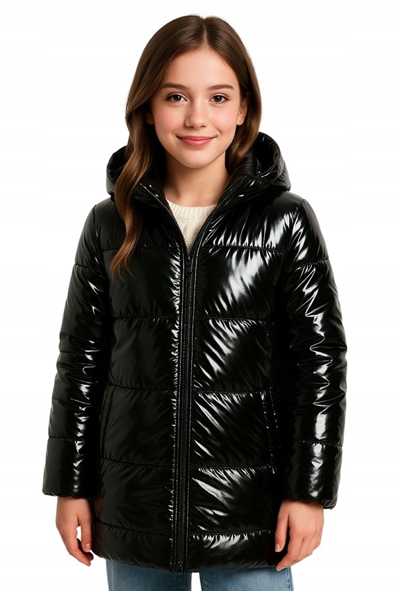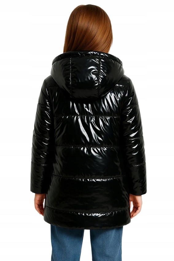 Na tej aukcji kupują Państwo kurtkę w kolorze czarnym błyszczącym, rozmiar 122.