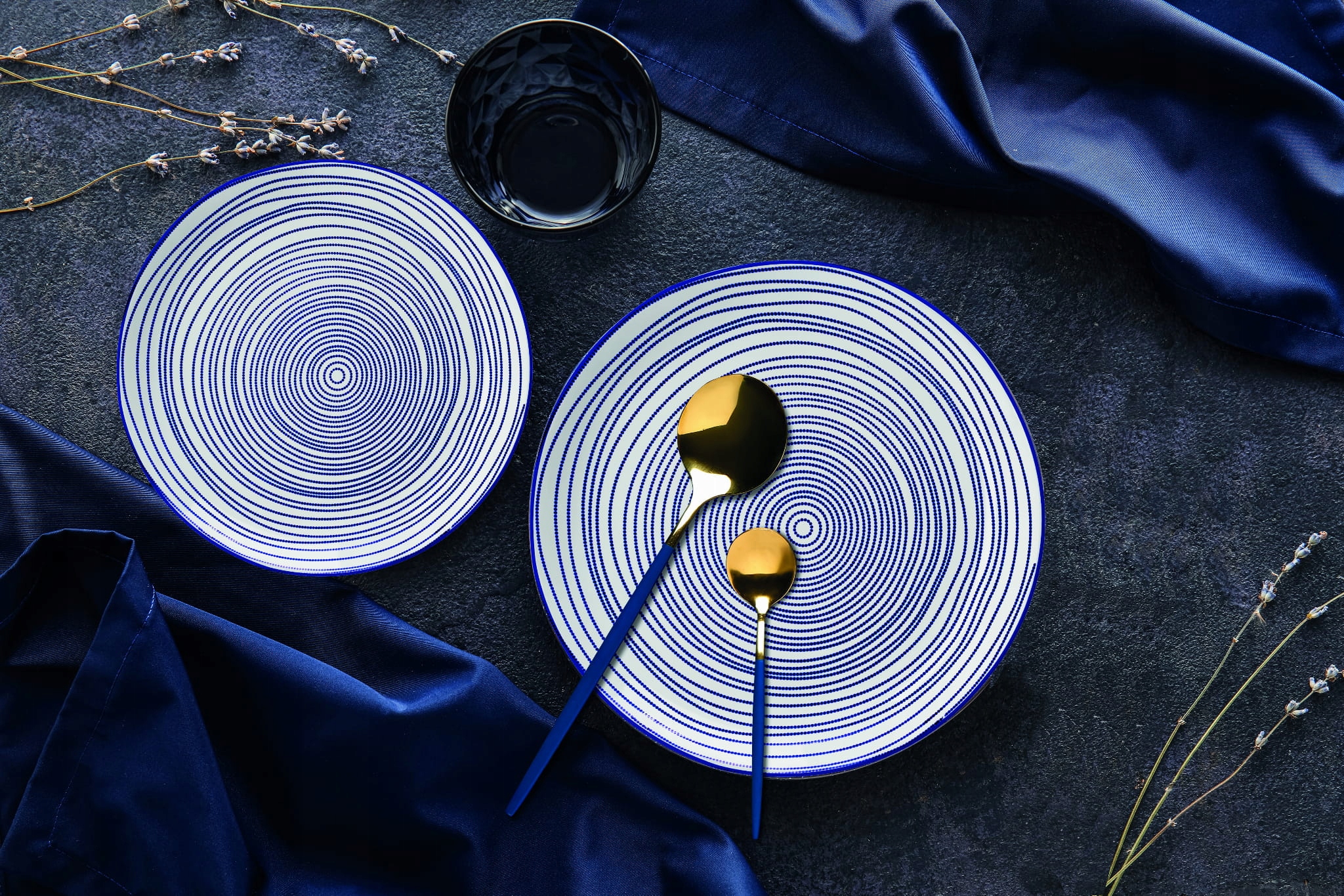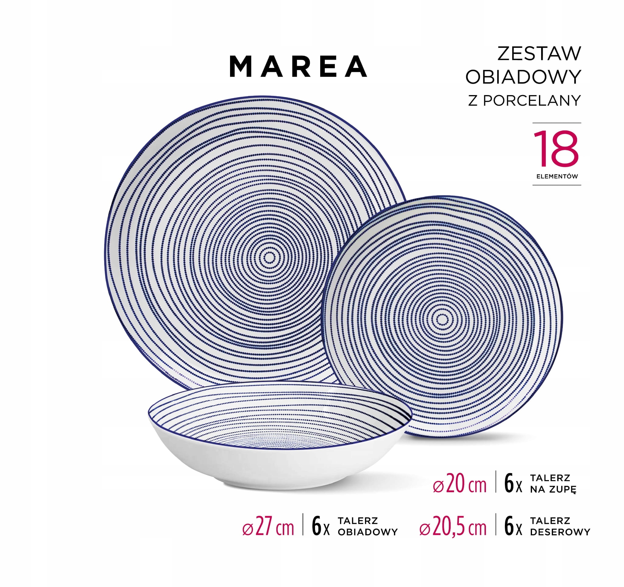 Kolekcja Marea zachwyca charakterystycznym, granatowym wzorem w koncentryczne linie, który dodaje nakryciu stołu świeżości i nowoczesnej elegancji. Wysokiej jakości porcelana jest gładka, higieniczna i łatwa w utrzymaniu czystości, a naczynia możesz myć w zmywarce i używać w kuchence mikrofalowej – idealny wybór na co dzień i od święta.