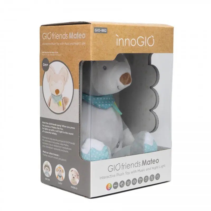 Bezpieczny od pierwszych dni życia. GIOfriends będą wsparciem w dobrym śnie na każdym etapie rozwoju dziecka. Lisek Mateo zostanie przyjacielem Twojego dziecka już od pierwszych dni życia i zostanie nim na długie lata. Świecący brzuszek może służyć jako lampka nocna dla bojącego się ciemności dziecka, które przed zaśnięciem lub po obudzenia dotyka brzuszka, włączając lampkę.