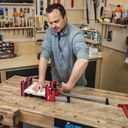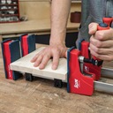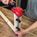 ✅ Aby móc wygodnie kleić korpusy również na stole warsztatowym, zacisk jest wyposażony w trzy wsporniki na szynie prowadzącej, które stabilnie utrzymują go na powierzchni roboczej. Pomiędzy szczękami znajdują się dwa wsporniki z zaokrąglonymi narożnikami zapobiegające uszkodzeniu materiału. Wspornik na końcu szyny prowadzącej służy jako ogranicznik szczęk i można go łatwo zdemontować podczas przekształcania w rozpierak.