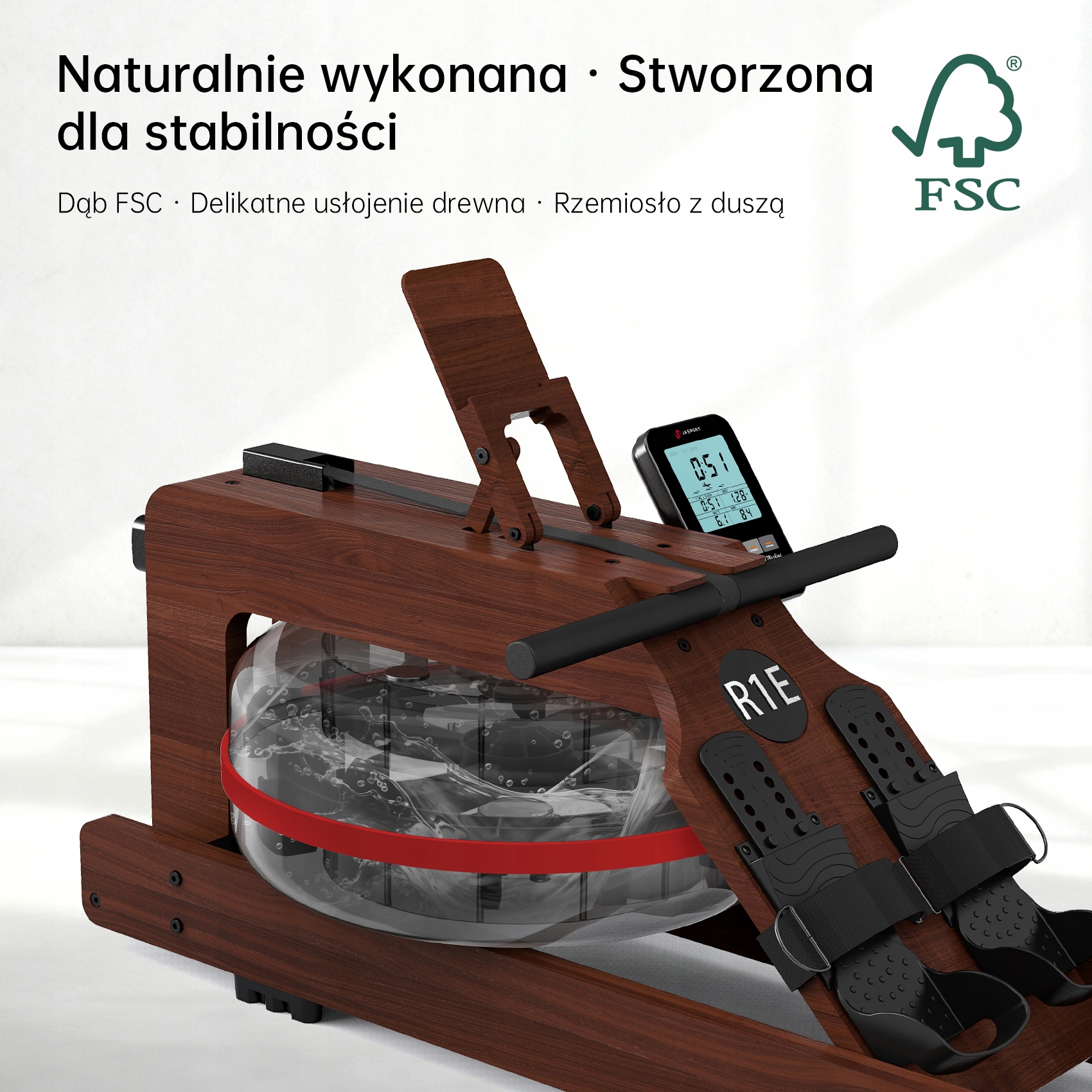 Wioślarz wodny JASPORT R1E, wykonany z litego dębu, łączy w sobie elegancki design z profesjonalną wydajnością treningową i doskonale nadaje się do domowych treningów. Wykonany z dębu z certyfikatem FSC, wioślarz zachwyca wysoką stabilnością, trwałością i naturalną estetyką. Drobno polerowane wykończenie o wyglądzie orzecha podkreśla ciepłe usłojenie drewna i zamienia maszynę w stylowy przyciągający wzrok w każdym domu. Jako drewniany wioślarz wodny klasy premium oferuje długotrwałą konstrukcję, która pozostaje niezawodna nawet podczas intensywnego treningu.