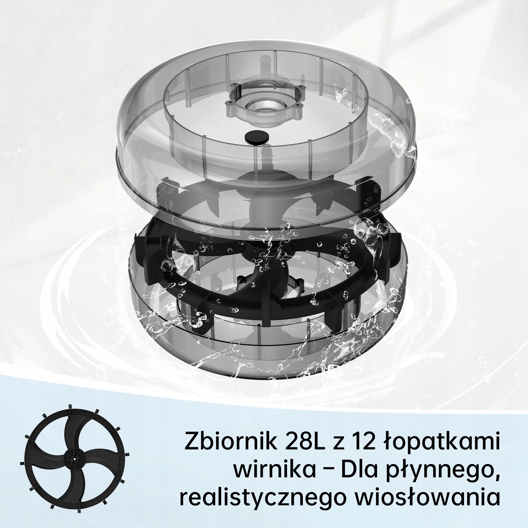 Duży 28-litrowy zbiornik na wodę z 12 hydrodynamicznymi wiosłami zapewnia płynną, równomierną i realistyczną wodoodporność. Każde pociągnięcie przypomina wiosłowanie po prawdziwej wodzie – ciche, harmonijne i delikatne dla stawów. Dzięki zróżnicowaniu poziomu wody, opór można indywidualnie regulować, co sprawia, że wioślarz jest idealny zarówno dla początkujących, jak i doświadczonych sportowców. Trening z wodoodpornością aktywuje do 85% Twoich mięśni, poprawia siłę, wytrzymałość i wydolność sercowo-naczyniową oraz zapewnia efektywny trening całego ciała w domu.