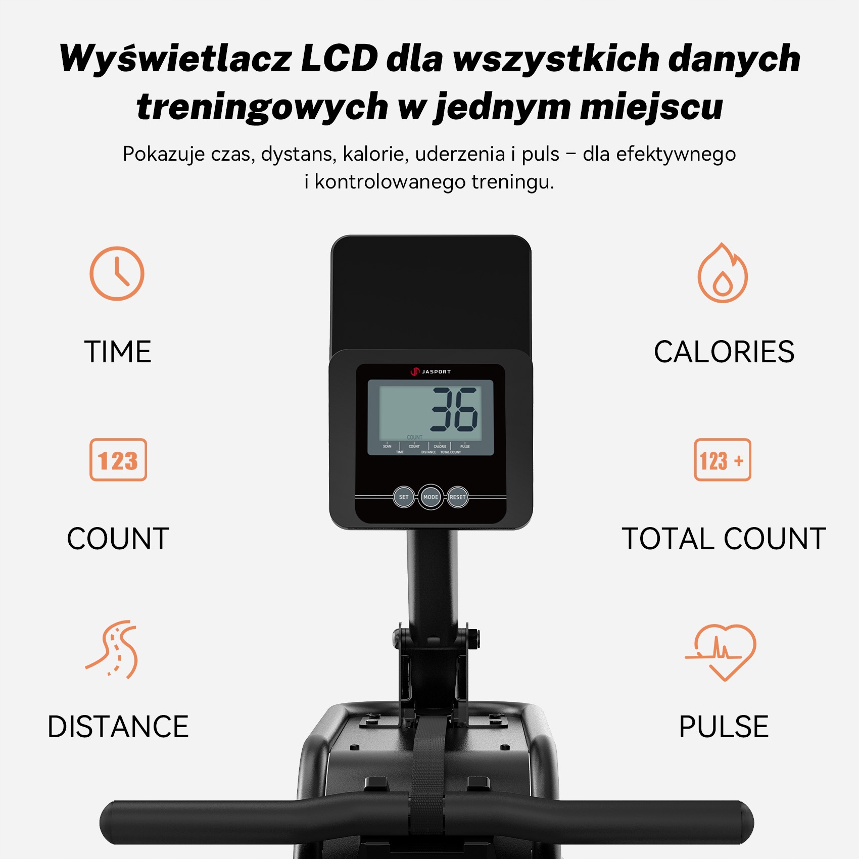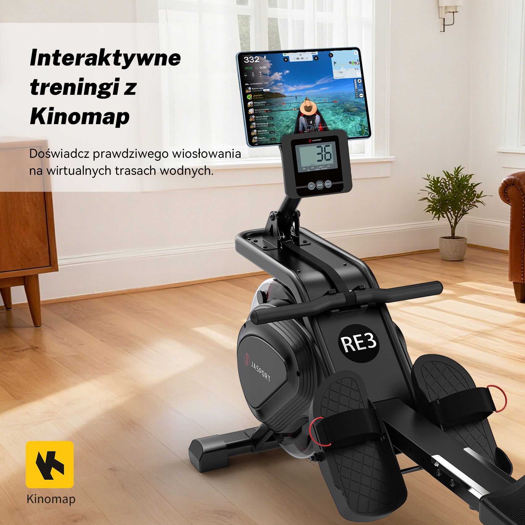 Dzięki kompatybilności z Bluetooth i Kinomap, JASPORT RE3 łączy się ze smartfonem lub tabletem, zapewniając interaktywne doświadczenie treningowe. Możesz cieszyć się wirtualnymi trasami wiosłowania, monitorować dane treningowe, takie jak czas, dystans, kalorie, uderzenia i tętno, i pozostać zmotywowanym przez wyzwania online.