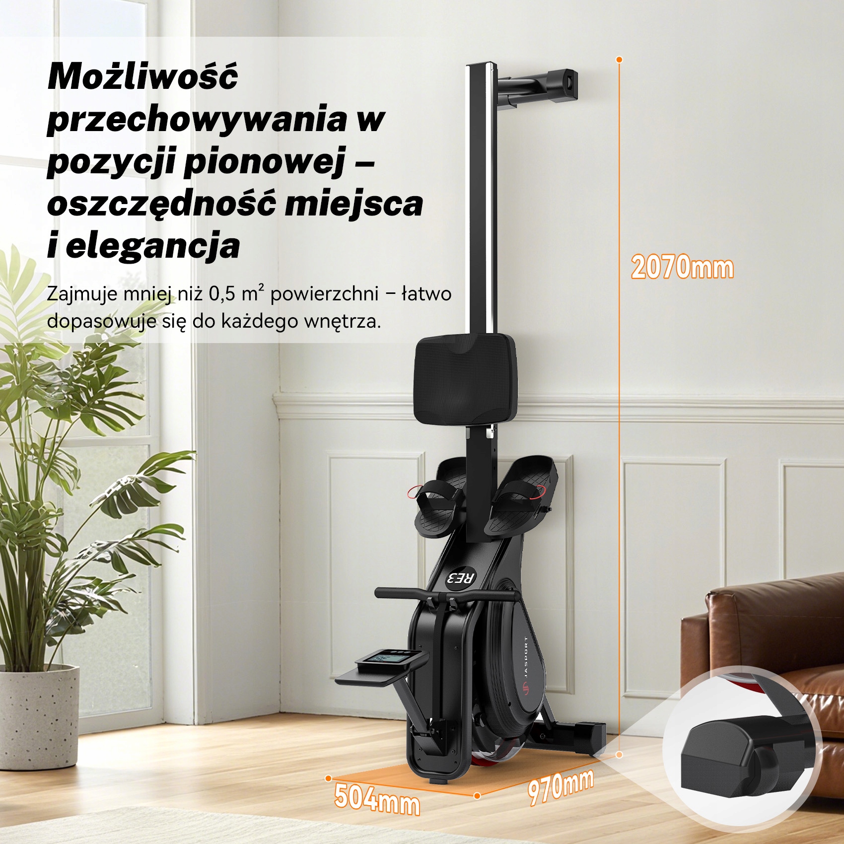Dzięki kompaktowej, zajmującej mało miejsca konstrukcji i zintegrowanym kółkom transportowym ten wioślarz wodny jest łatwy do przesuwania i przechowywania w pionie. JASPORT RE3 Home Rowing Machine łączy w sobie stabilność, wydajność i realistyczną wydajność wiosłowania — idealny sprzęt fitness w pomieszczeniach do nowoczesnego, cichego i motywującego treningu domowego.