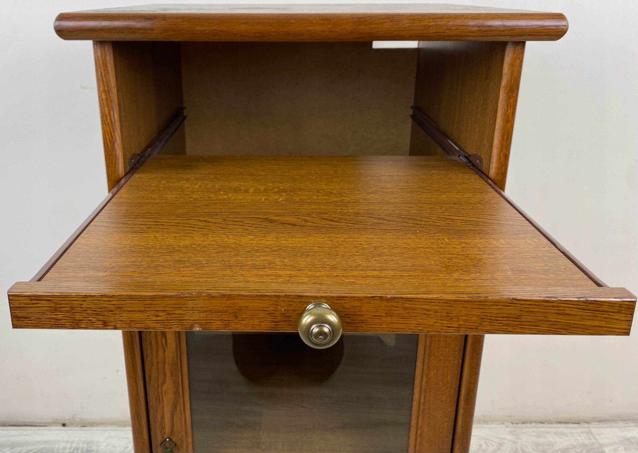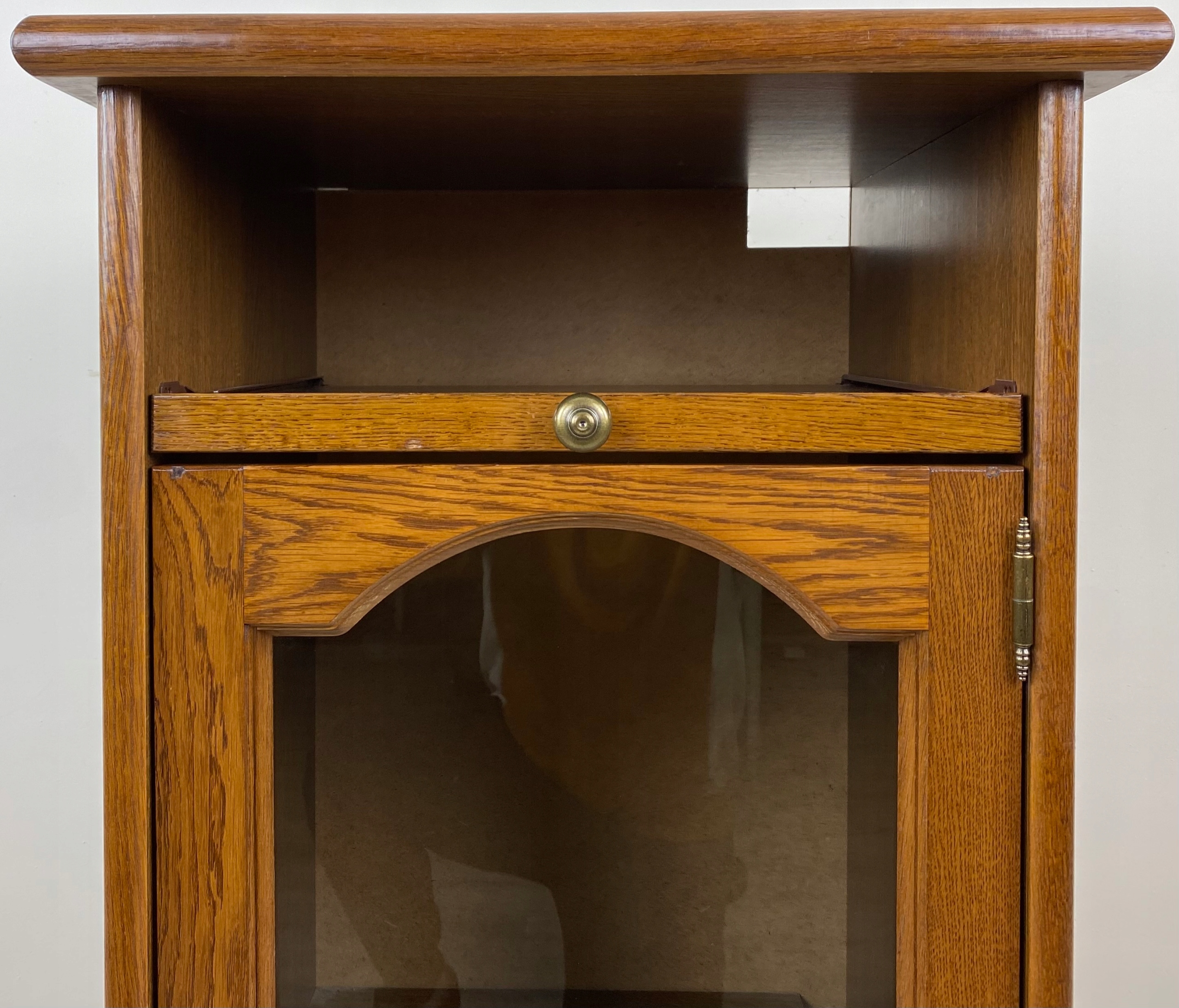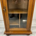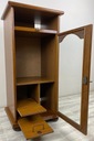 Posiada jeden przeszklony uchylny fronty. Wewnątrz półka oraz dwie wysuwane półeczki. Dodatkowo jeden otwarty wysuwny blat.