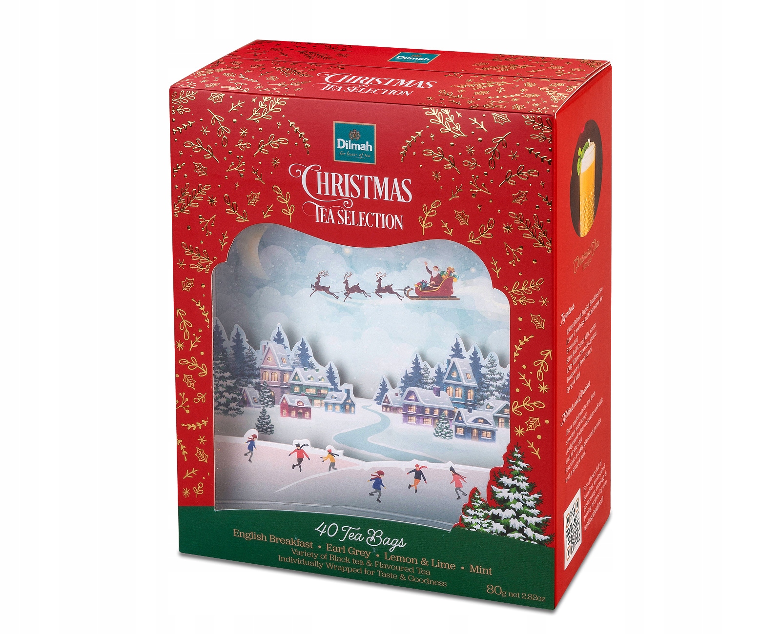 Herbaciany zestaw złożony z 4 rodzajów herbat. Znajdziemy w nim klasyczny czarny English Breakfast, Earl Greya aromatyzowanego bergamotką oraz dwie herbaty czarne aromatyzowane - o smaku cytryny z limonką oraz mięty. Opakowanie ozdobione jest trójwymiarową bożonarodzeniową scenką, przez co świetnie się nadaje na prezent mikołajkowy, pod choinkę lub jako niezobowiązujący upominek wręczany przez gości gospodarzom świątecznych przyjęć.