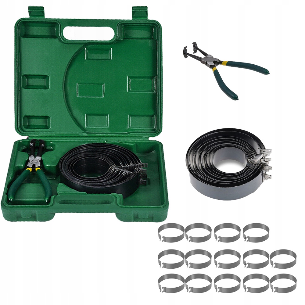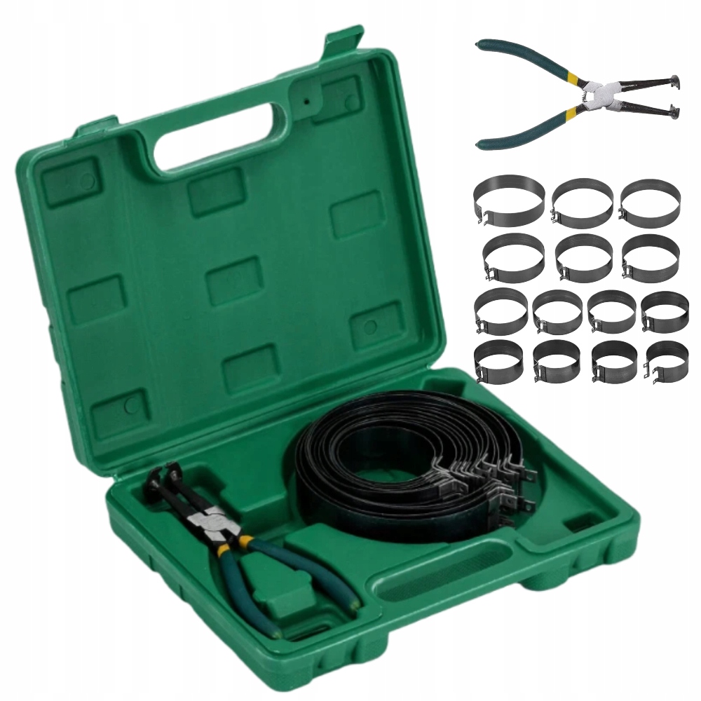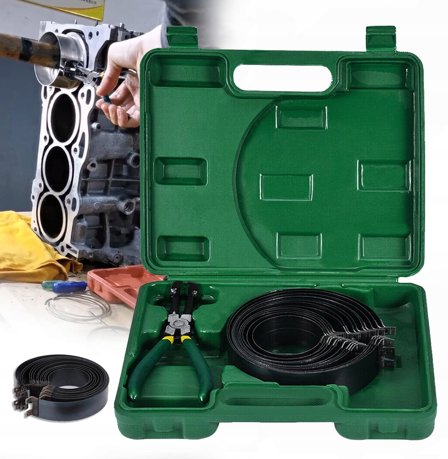 Zestaw narzędzi do ściskania pierścieni tłokowych do montażu w cylindrach.