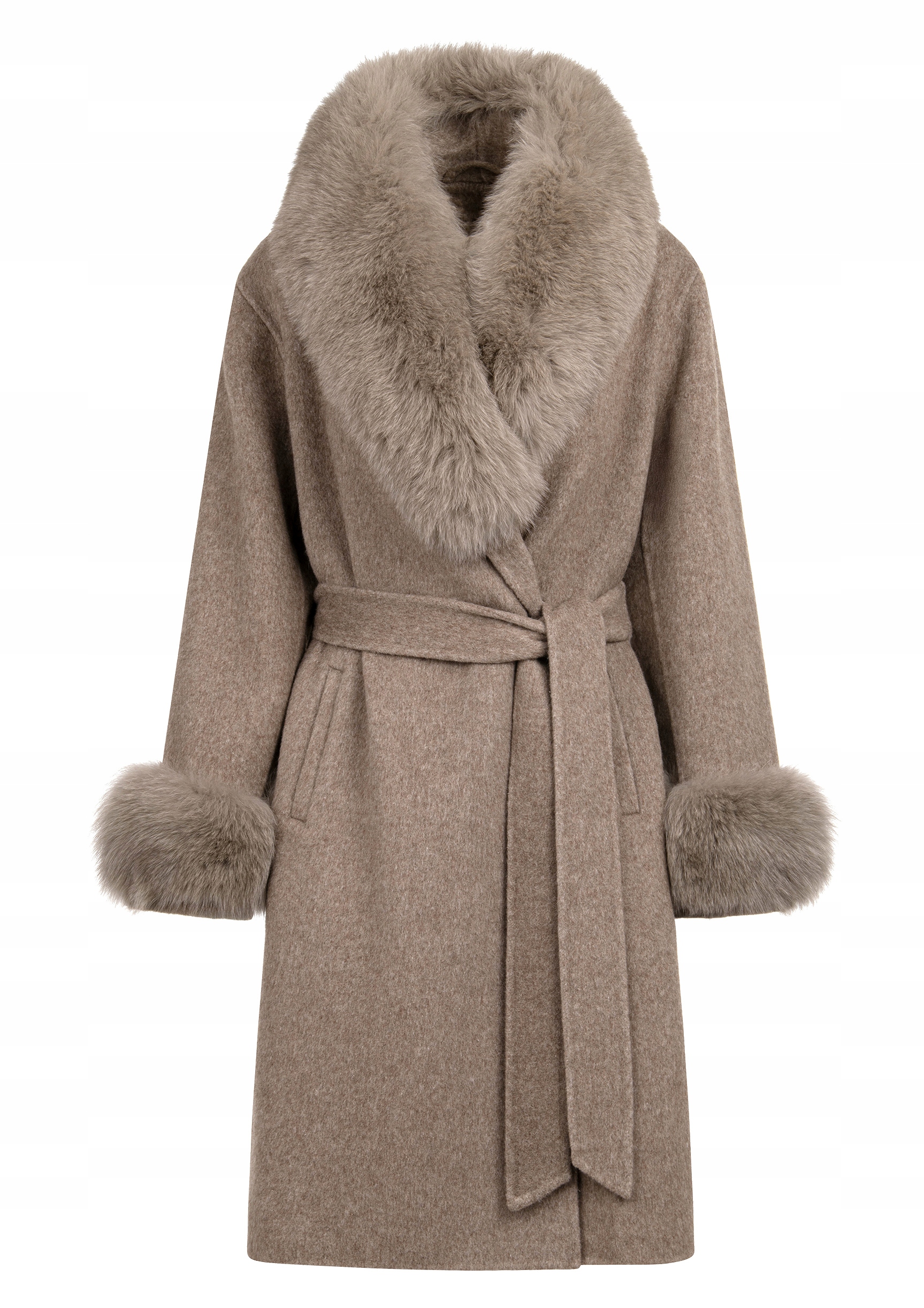 Futro ma długość za kolano, co podkreśla jego klasyczny fason i zapewnia dodatkową ochronę przed zimnem. Wiązany w talii pasek pięknie modeluje sylwetkę, a dwie wpuszczane kieszenie i zapięcie na dyskretne napy łączą funkcjonalność z elegancją.