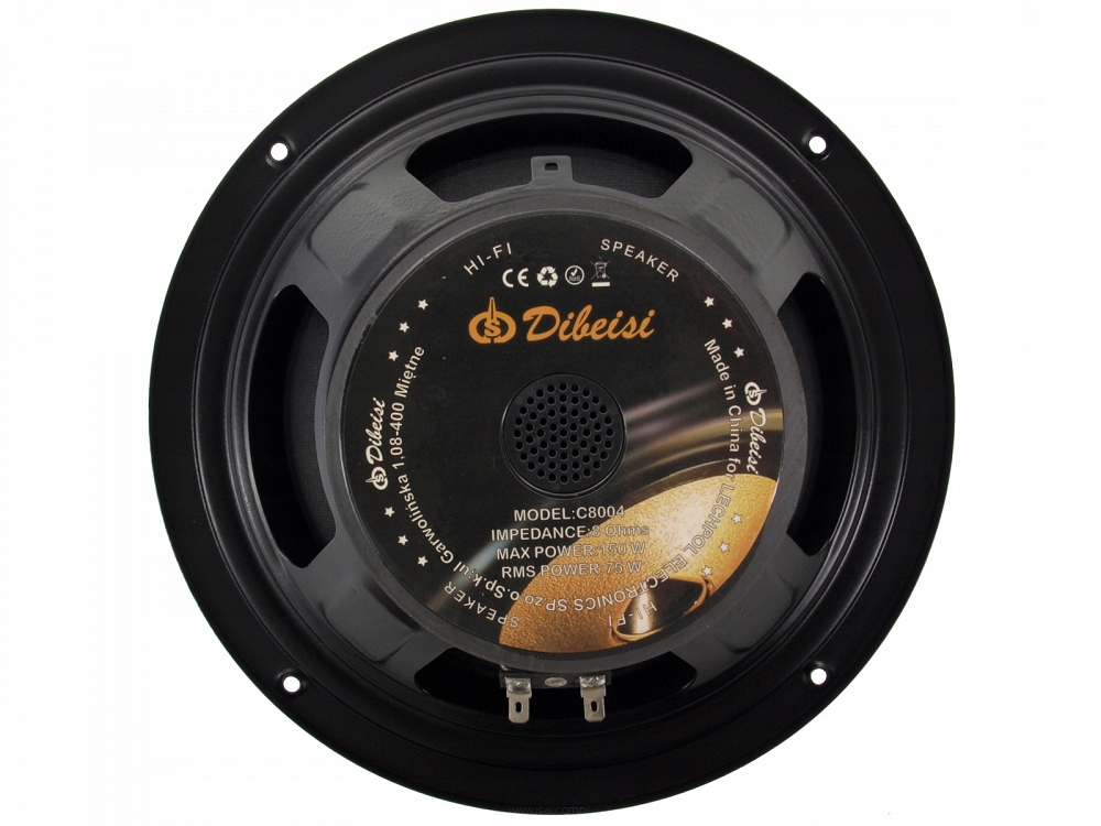 Głośnik nisko-tonowy marki Dibeisi model C8004 o średnicy 8" (20cm), mocy maksymalnej 150W i impedancji 8ohm.