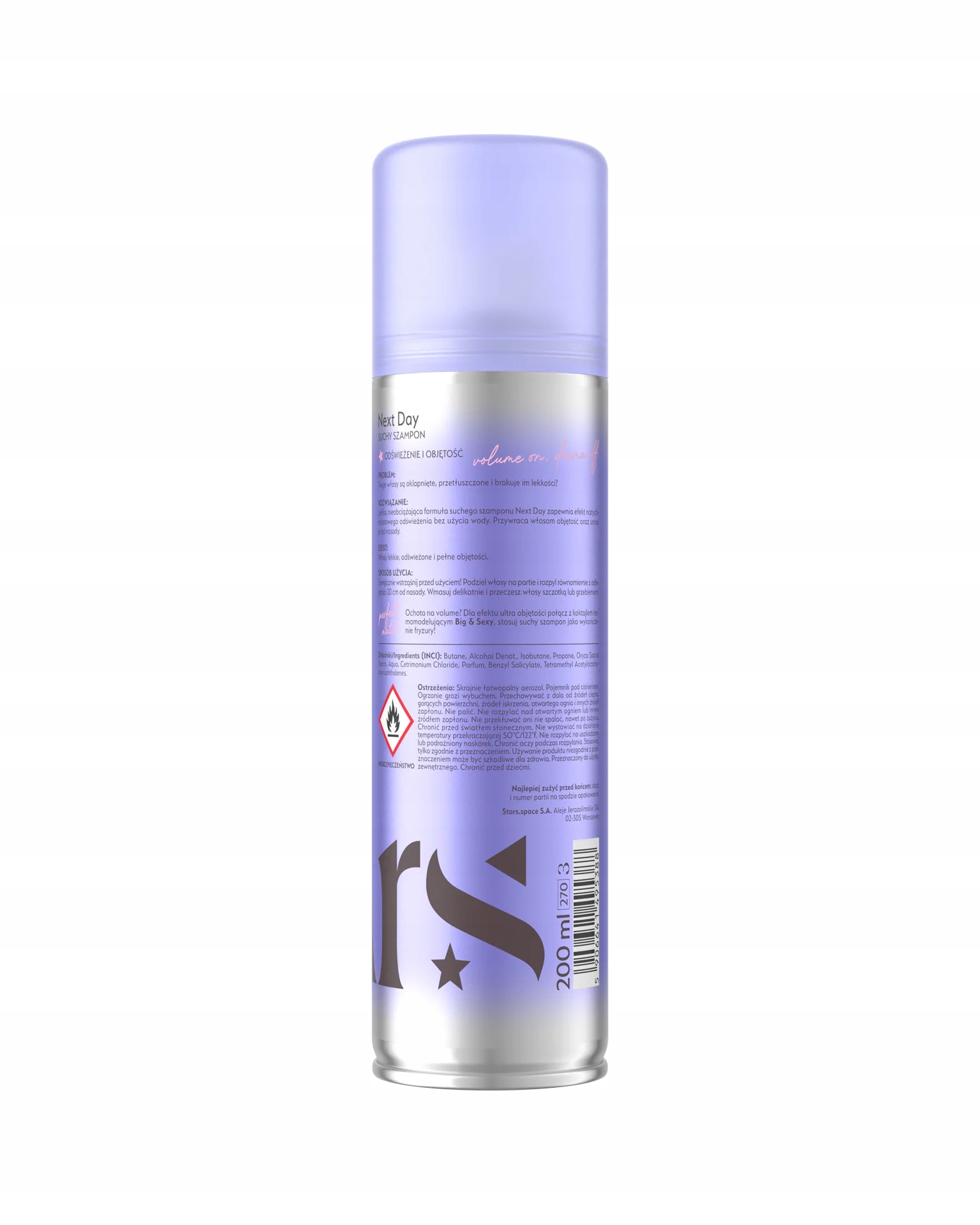 Składniki/Ingredients (INCI): Butane, Alcohol Denat., Isobutane, Propane, Oryza Sativa Starch, Aqua, Cetrimonium Chloride, Parfum, Benzyl Salicylate, Tetramethyl Acetyloctahydronaphthalenes.
