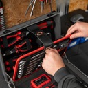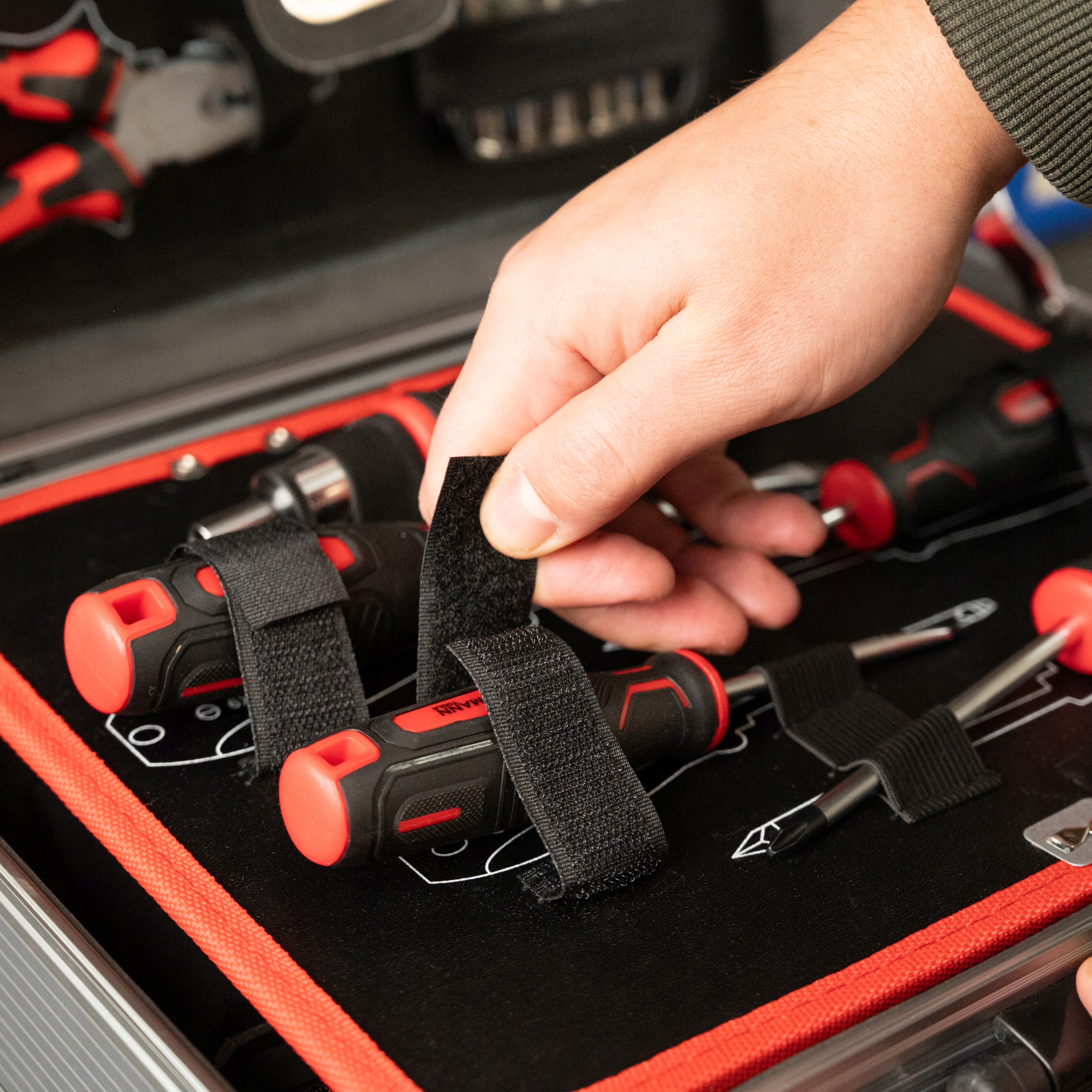 Każde narzędzie ma wyznaczone miejsce na tablicy cieni, a elastyczne rzepy pewnie je przytrzymują. Dzięki temu wszystkie elementy są zawsze widoczne, łatwo dostępne i bezpieczne podczas transportu.