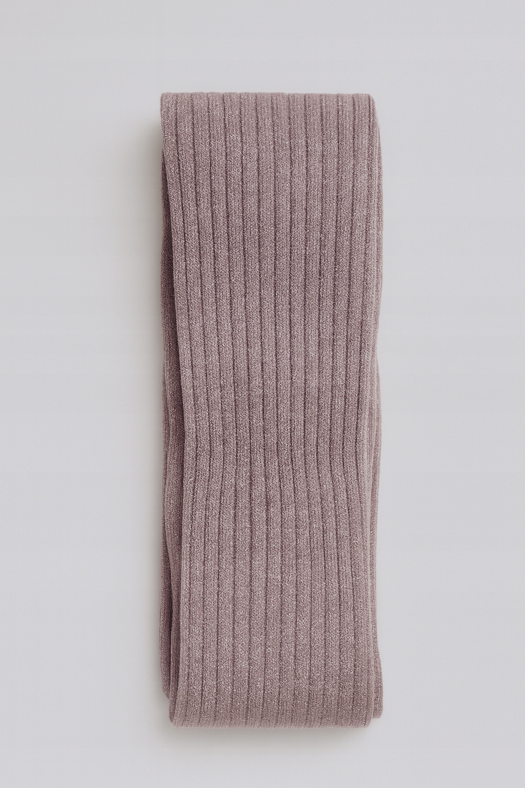 Wysokiej jakości rajstopy bawełniane o prążkowanej strukturze w pięknym zgaszonym odcieniu lila. Pięknie połyskują dzięki wplecionej metalizowanej nici.