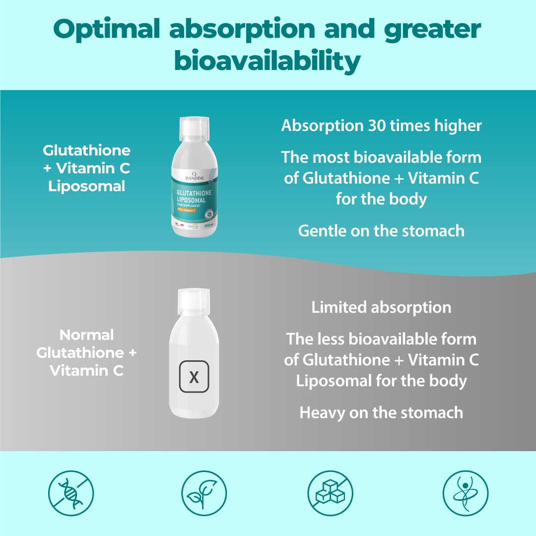 TECHNOLOGIA LIPOSOMALNA DLA WZMOCNIONEGO DZIAŁANIA. Nasza innowacyjna technologia liposomalna chroni składniki aktywne przed kwasowością żołądka, sprzyjając ich bezpośredniemu wchłanianiu do komórek. Ten zaawansowany preparat sprawia, że Glutation i Witamina C osiągają swoją maksymalną skuteczność. Dzięki mieszance starannie dobranych składników w wygodnej formie płynnej, ten suplement zapewnia niezawodne wsparcie dla zdrowia komórkowego i odpornościowego.