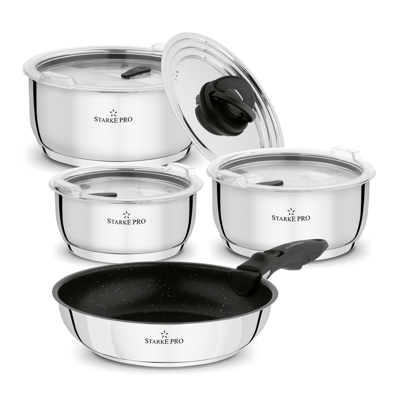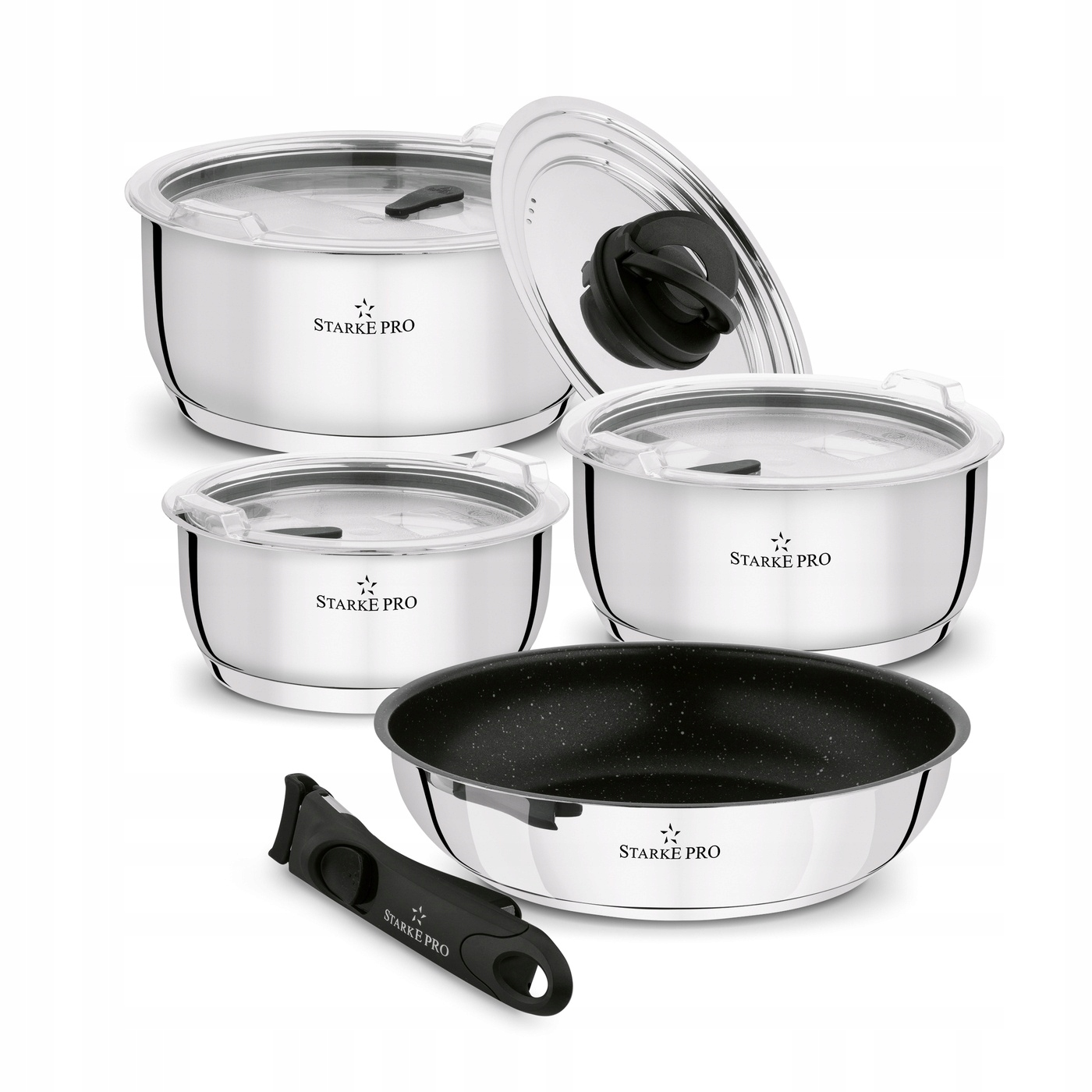 Pozostałe informacje: - garnki wykonane z wysokiej jakości stali nierdzewnej 18/10, - grubość ścianki: 0,5 mm, - grubość dna: 3 mm, - pokrywa uniwersalna, stalowa z uchwytem z tworzywa sztucznego, - składany uchwyt ułatwiający przechowywanie, - pokrywki z tworzywa sztucznego z silikonową uszczelką i otworem odpowietrzającym, odporne na temperaturę od - 40 do + 99 st. C, - po założeniu pokryw z tworzywa możliwośc ułożenia garnka na garnku, - rączka odpinana z tworzywa sztucznego, - uchwyt rączki wykończony silikonem zabezpiecza rant garnka przed uszkodzeniem, - patelnia pokryta powłoką non stick, - patelnię i pokrywki z tworzywa sztucznego zalecamy myć ręcznie