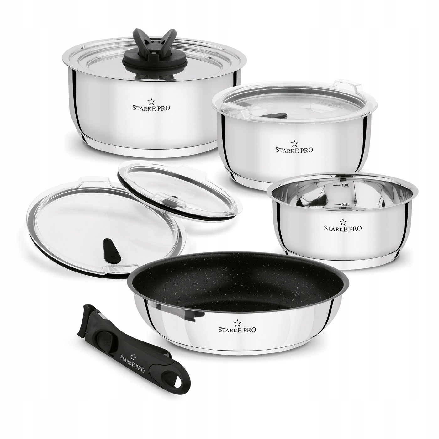 Komplet garnków z patelnią non-stick Starke Pro Solve 9 elementów wykonany jest ze stali nierdzewnej 18/10. Dzięki temu jest świetnie wyważony i poręczny. Energooszczędność daje tu specjalna budowa dna. To dzięki niemu możesz używać prezentowanych garnków i patelni na każdej kuchence. Przenoszenie i użytkowanie zestawu zapewnia rączka, która wolno się nagrzewa i pewnie leży w dłoni. Jest ona uniwersalna i odpinana, a więc pasuje do każdej średnicy garnka i patelni z powłoką non-stick Solve. Z jej pomocą o wiele łatwiej zmieścisz naczynia w kuchennej szafce lub szufladzie. Z tym kompletem bez problemu stworzysz też swój własny zestaw naczyń kuchennych do domowego użytku i dla całej rodziny. W zestawie znajdziesz również uniwersalną pokrywę do każdego z garnków i 3 pokrywki z tworzywa sztucznego służące zabezpieczeniu zawartości podczas przechowywania i stabilnemu ustawieniu garnków jeden na drugim. Na dodatek powłoka nieprzywierająca, którą pokryta jest wewnątrz patelnia, umożliwi ci smażenie na niewielkiej ilości tłuszczu oraz bezproblemową pielęgnację. Zniesie przy tym też aż do 8 000 cykli ścierania (4 razy więcej niż zwykłe naczynia non-stick dostępne na rynku). Jej wysoka jakość, twardość oraz struktura zostały opracowane z myślą o wieloletnim gotowaniu i smażeniu. To jedna z najlepszych opcji w tej kategorii – zdejmując uchwyt, możesz myć prezentowane garnki w zmywarce!