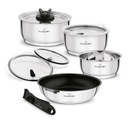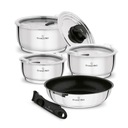 Skład zestawu: - garnek 16 cm, - garnek 18 cm, - garnek 20 cm, - patelnia 24 cm, - pokrywka uniwersalna, - 3 pokrywki z tworzywa sztucznego, - odpinana rączka