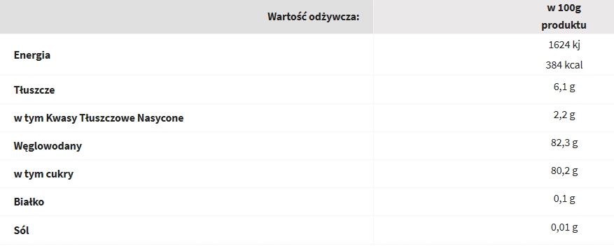 Składniki: cukier, woda, olej roślinny palmowy i rzepakowy, syrop glukozowy, skrobie modyfikowane, koncentrat z alg i szafranu, barwniki (dwutlenek tytanu, kwas karminowy, luteina), emulgator (monostearynian polioksyetylenosorbitolu), substancja konserwująca (sorbinian potasu), aromat naturalny, substancja zagęszczająca (pektyny), regulator kwasowości (kwas cytrynowy).