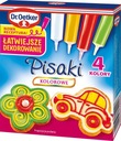 Własnoręcznie ozdobione torty, ciasta i ciasteczka przy pomocy naszych pisaków to niezawodny sposób na kreatywne spędzenie czasu w kuchni i zaimponowanie gościom. Dla Twojej wygody kolorowe, cukrowe kremy umieściliśmy w funkcjonalnych tubach, z których bez trudu w zależności od inwencji i wyobraźni wyciśniesz różne dekoracyjne motywy. Przy ich pomocy możesz złożyć życzenia, wyrazić uczucia, podkreślić okazję, a Twoje specjały zyskają ozdobny rysunek i fantazyjną dedykację. Receptury pisaków zostały skomponowane w oparciu o najwyższej jakości składniki przy użyciu wyłącznie naturalnych barwników oraz aromatów. Najlepszy efekt uzyskasz używając pisaków w kompozycji z tłem wykonanym wcześniej z kolorowych lukrów i polew Dr. Oetkera lub rysując na suchych powierzchniach ciasta. Ozdabianie tortów, ciast lub ciasteczek naszymi Pisakami to nie tylko oryginalny pomysł na deser, ale również wspaniała zabawa dla Ciebie i Twoich pociech.