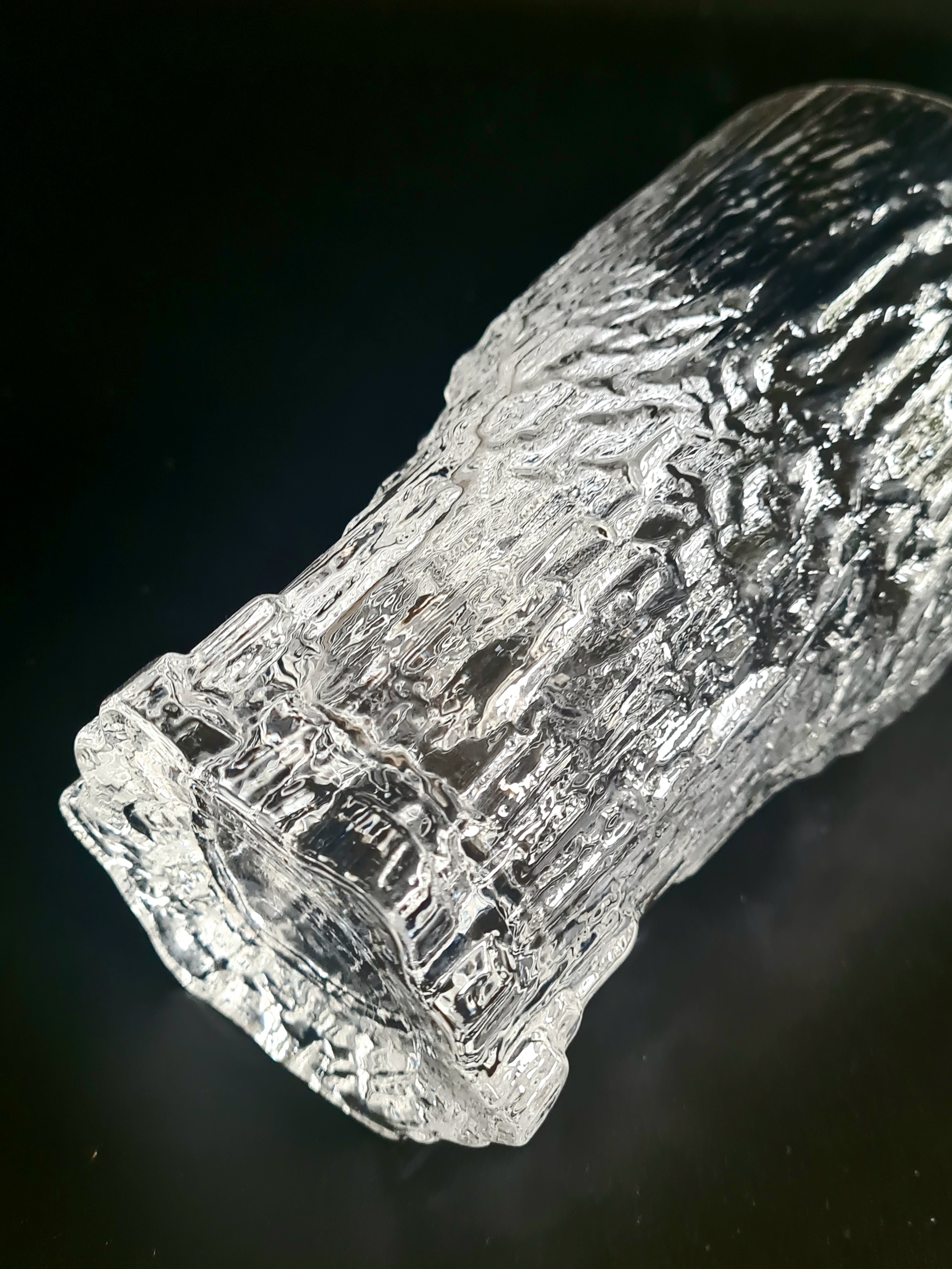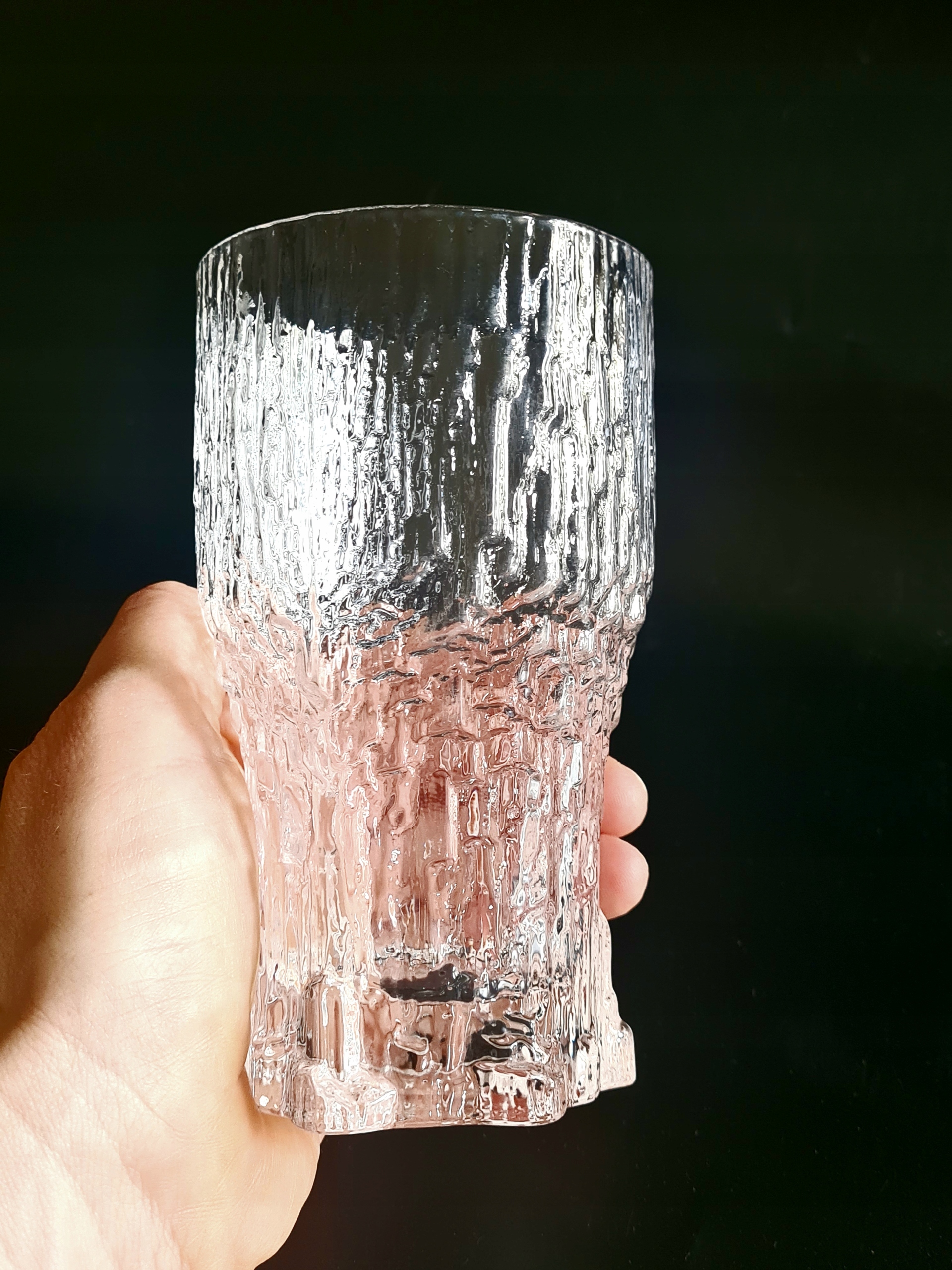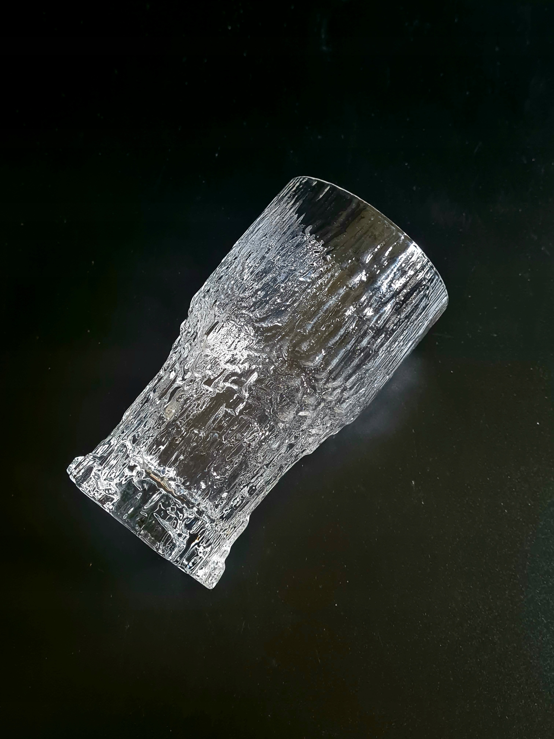 Wyjątkowa wysoka szklanka o pojemności 375 ml (idealna na 350 ml) do wody, piwa, koktajli. Oryginalna, chropowata faktura, bardzo rzeźbiarka o fakturze lodu. Jest to szklanka z serii "Aslak" wyprodukowana przez Ittala, projekt Tapio Wirkkala. Doskonale leży w dłoni.