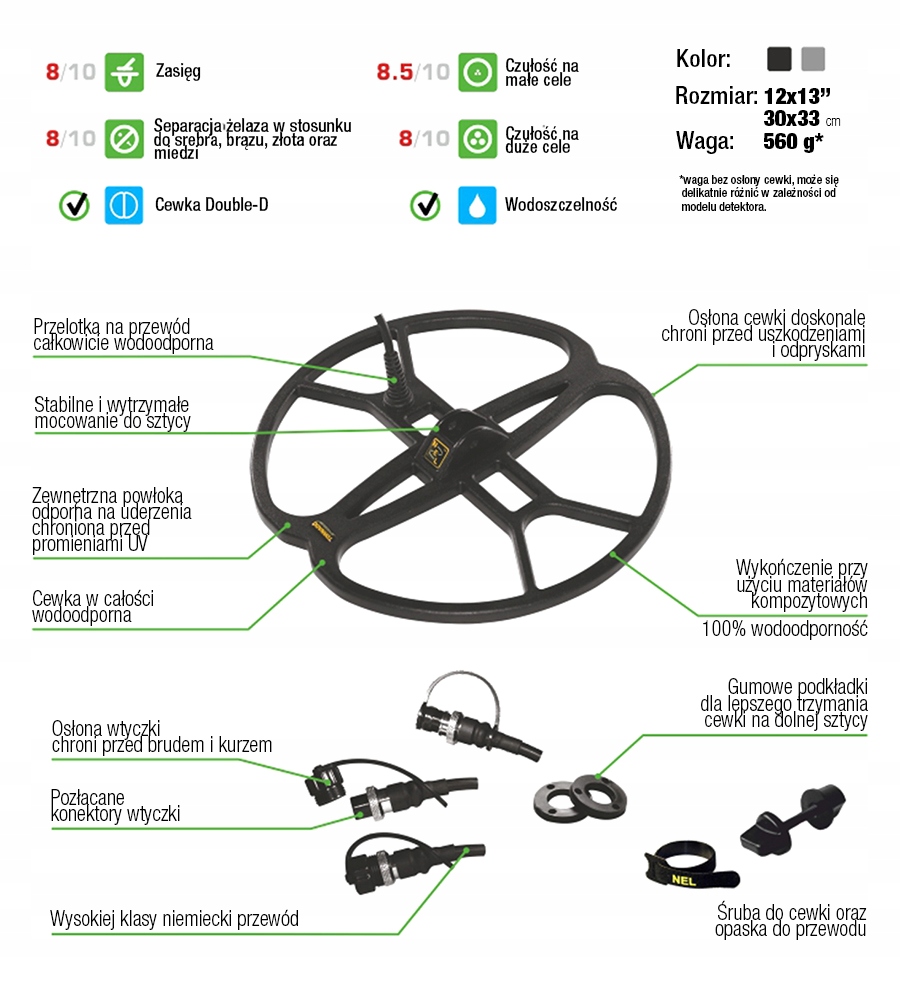 Odpowiednia cewka do wykrywacza metali to klucz do sukcesu detektorysty. Model Nel Tornado to propozycja zamiennika standardowych cewek ze względu na wyższą czułość. Jej niska waga (560 g) pozwoli Ci na całodzienne poszukiwanie metali bez nadwyrężania ręki. Sonda świetnie sobie radzi nawet w glebie zasolonej i zanieczyszczonej żelazem. Co więcej, jest ona wodoodporna, co znacznie ułatwia poszukiwanie w trudnym terenie lub przy niekorzystnych warunkach. Jeśli myślisz o wymianie standardowej cewki, wybierz większą i bardziej precyzyjną cewkę Nel Tornado.